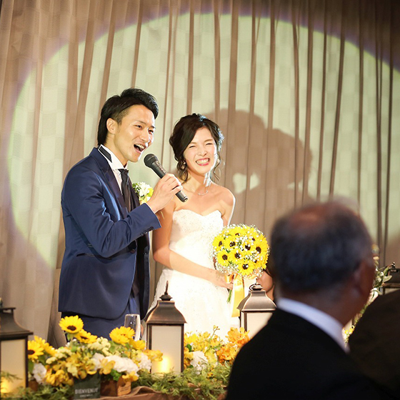 けど、当日は友人たちがたくさん盛り上げてくれて、たくさん笑いが起きて、プレッシャーも緊張も一気に無くなり、リラックスして過ごすことができました。おかげで肝心の挨拶もバッチリ喋れましたし、気楽に自分自身もすごく楽しむことができました。結婚式って新郎は気配りをしたり挨拶のことを考えたりしなきゃで、楽しむ余裕なんて無いと思ってましたが、本当に楽しかったです!!