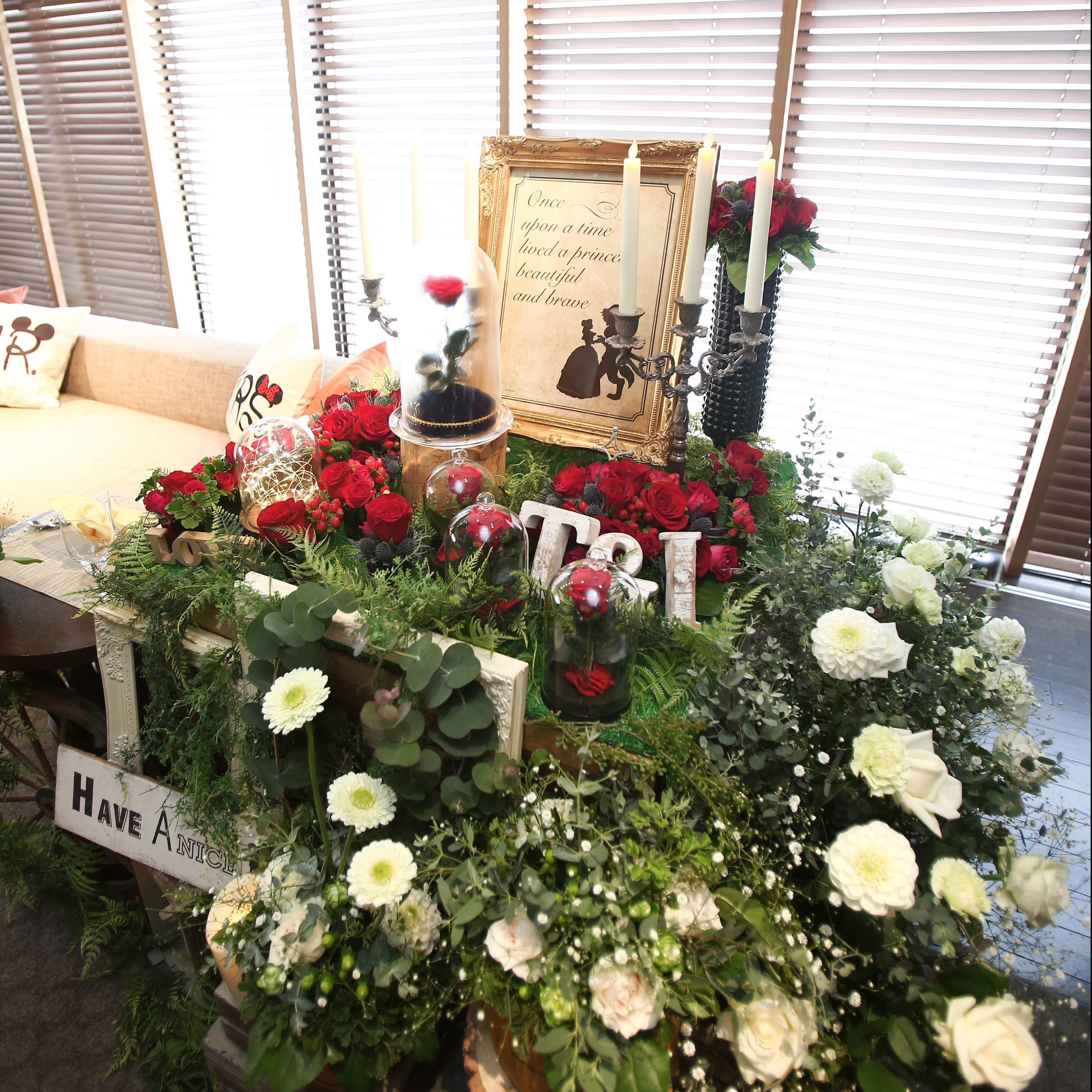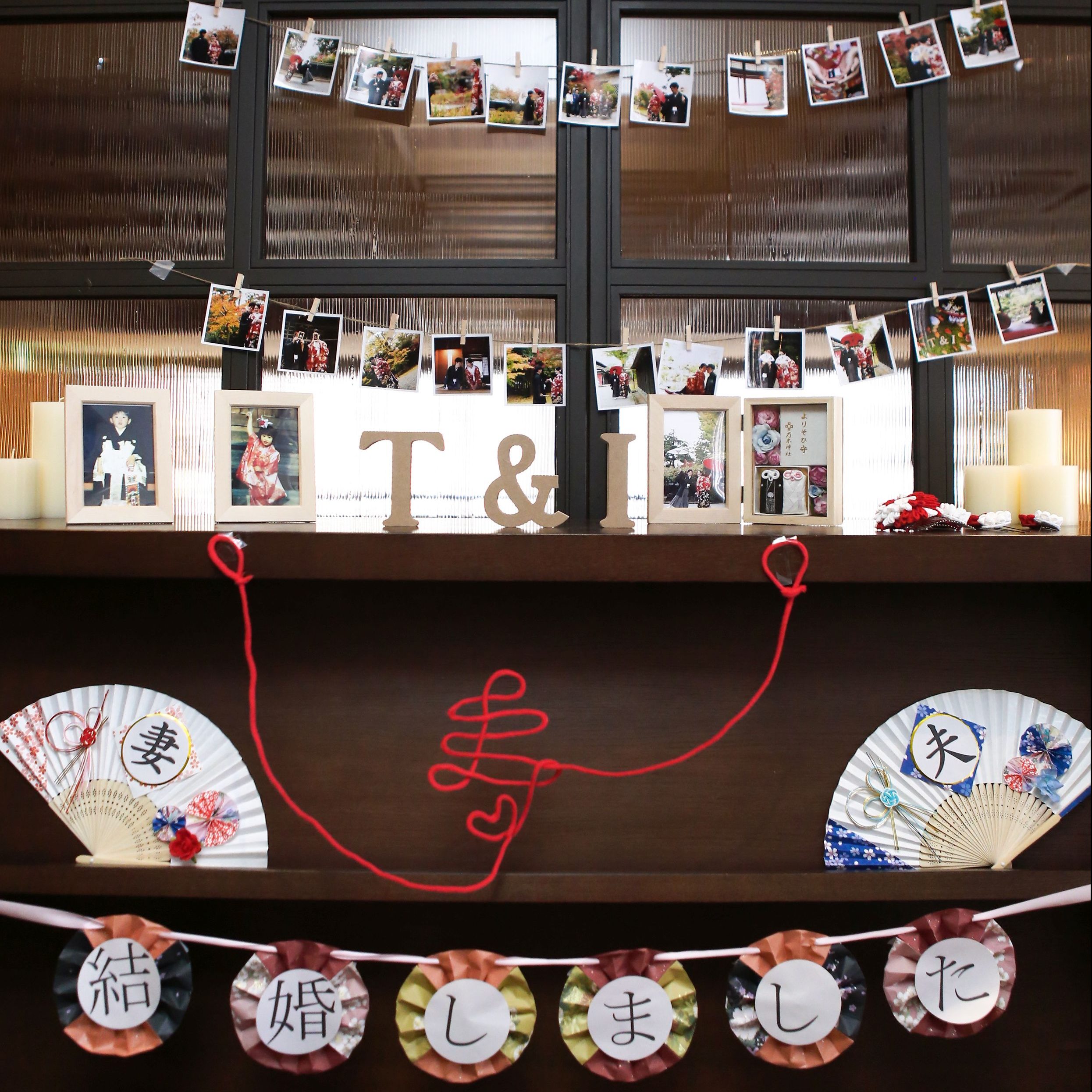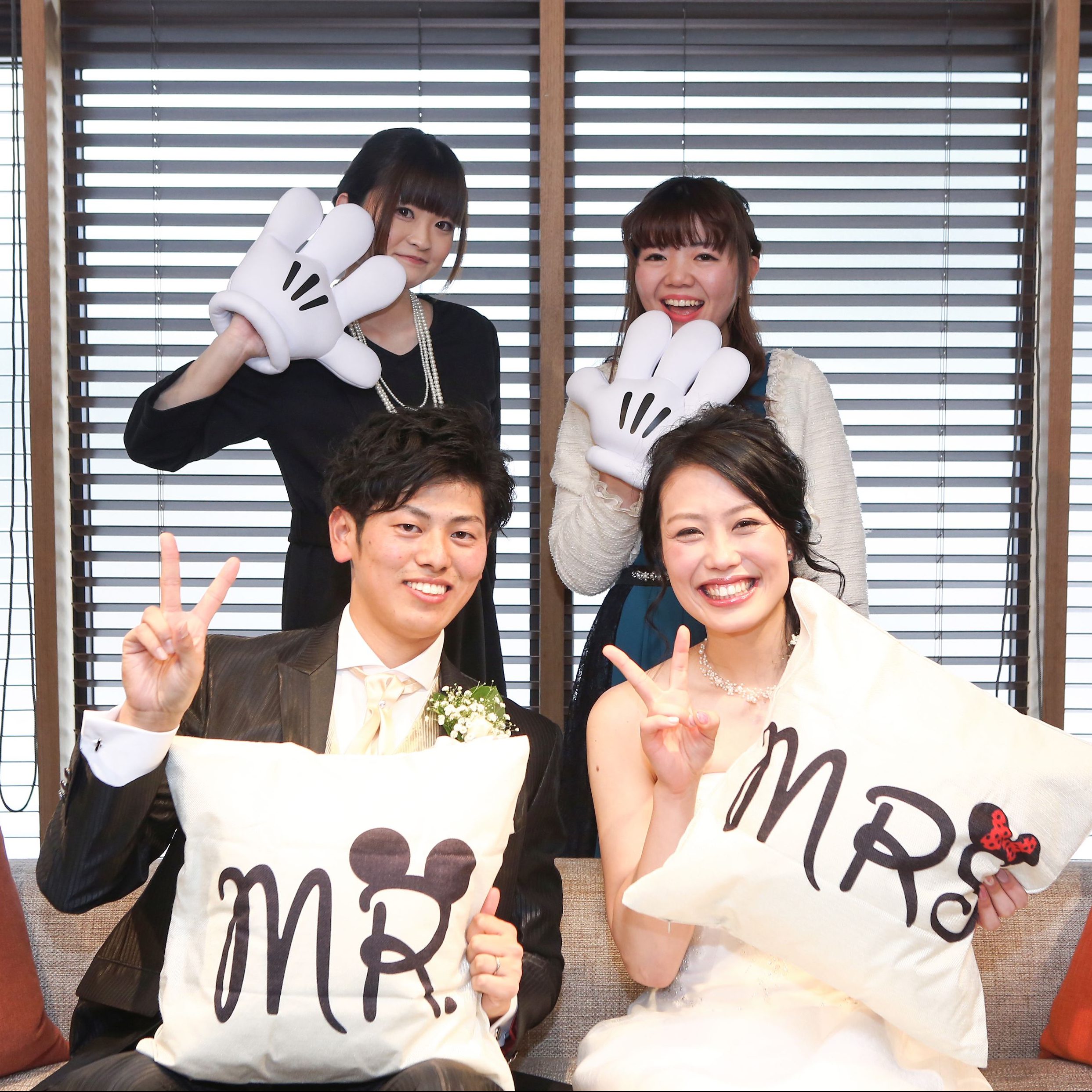 1番は決められないですが、まずは来ていただくゲストの方々に喜んでもらいたく、スペシャルビュッフェをしました。取りに来やすいようにビュッフェコーナーでケーキを手渡すなどの工夫もしました。披露宴ではかしこまらずアットホームな空間にしたくて、高砂はソファにしました。写真を撮るとき用のアイテムとして可愛いクッションやミッキーの手を置いたのもポイントです。ウェルカムスペースでは私たちの好きなものや、100枚近くの思い出の写真を飾りました。飾るスペースが沢山あるので前撮りコーナーとして前撮りの写真、使用したDIYアイテムも飾れました。