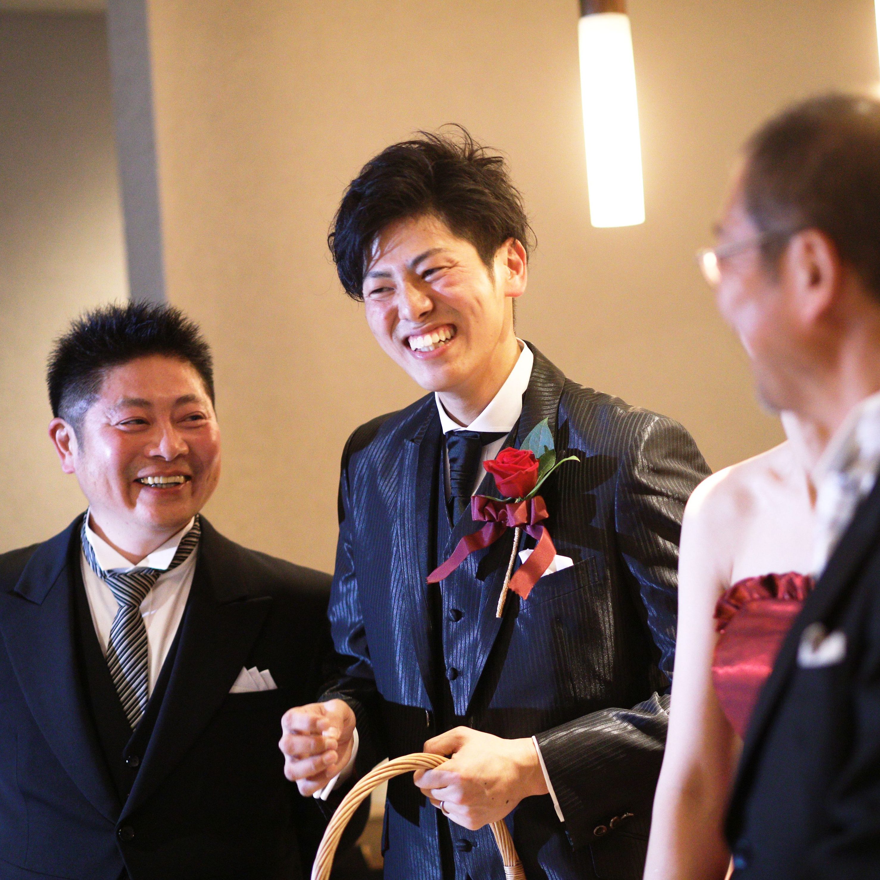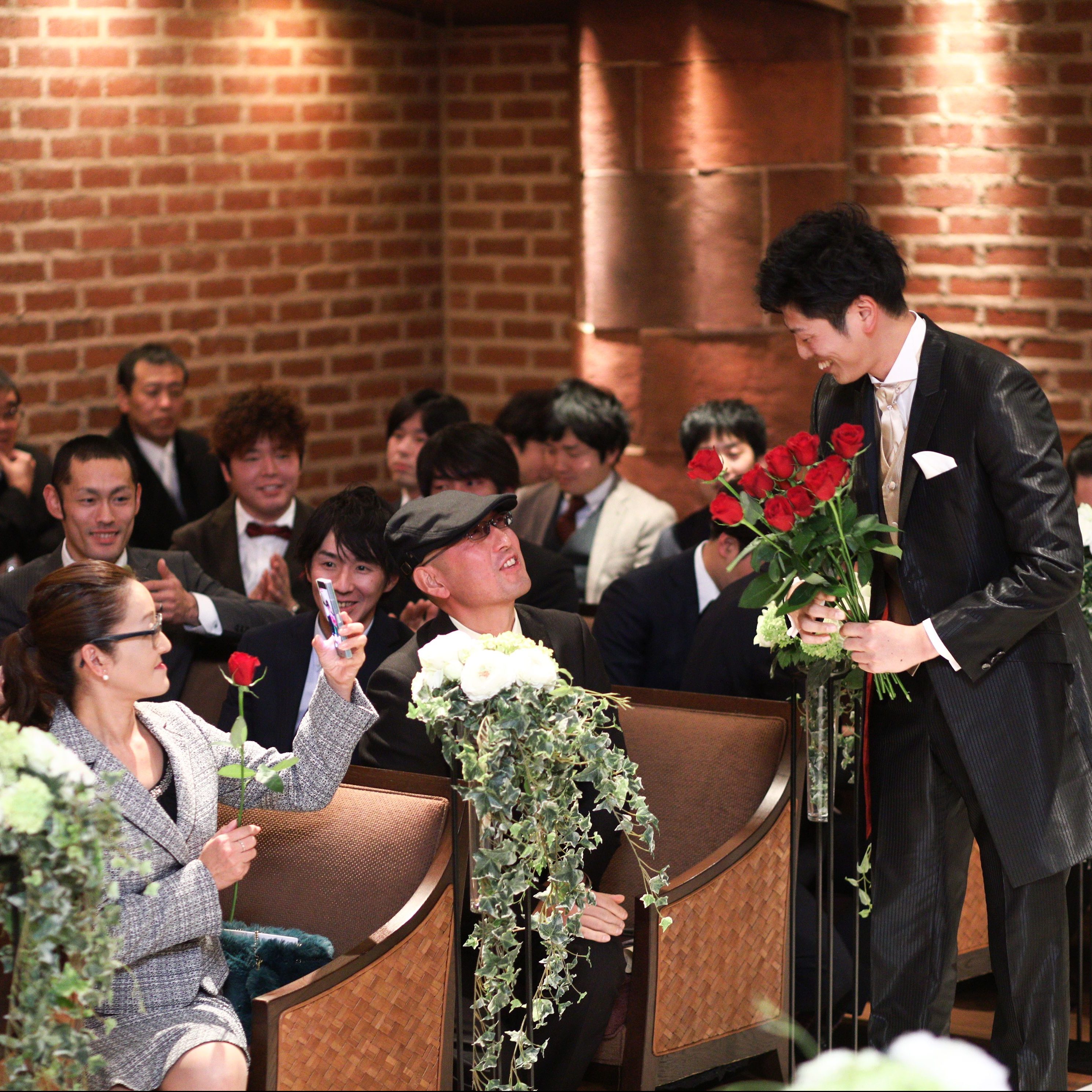 当日、新郎は挙式入場の際、とても緊張していたそうですが、ブーケブートニアセレモニーのゲストの方々からバラをもらいゲストとふれあうことで、自然と笑顔になり緊張がほぐれたそうです。