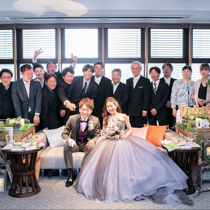 派手で豪華な演出は最小限にして、ゲストとの歓談できる場面を多く設けました。たくさん写真を撮りたいと思っていたので、素敵な装花に囲まれた高砂ソファーなので、テーブルラウンドではなくソファでゲストのみなさんとゆっくり写真撮影の時間をお願いしました。