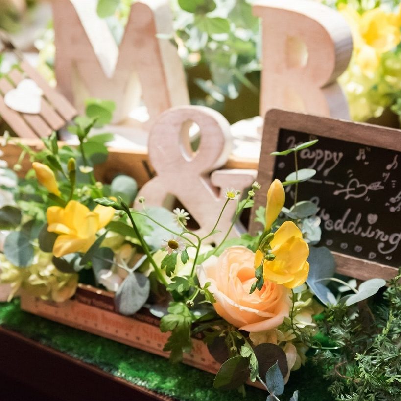 キラキラした雰囲気よりはナチュラルでゲストのみなさんがくつろげるような雰囲気にしたいな~と思ったのと、自分が結婚式に招待された時、どんな風だったら嬉しいかな?ということを常に考えていて、自分たちの好きなものが垣間見えるようにしたいなと思い、ウェルカムスペースには自宅で飾っているものをたくさん持ち込んだり、多肉植物を飾ったり、待合スペースにふたりが好きな本を置かせてもらったり。