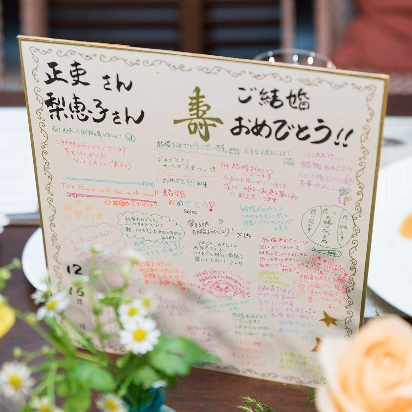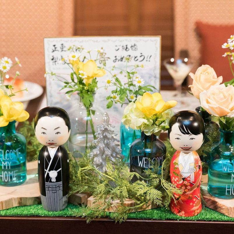 また、新婦中座の際、エスコートの妹弟たちからサプライズでふたりの似顔絵のこけしとゲストからの色紙をいただき、本当にびっくり!嬉しかったです。