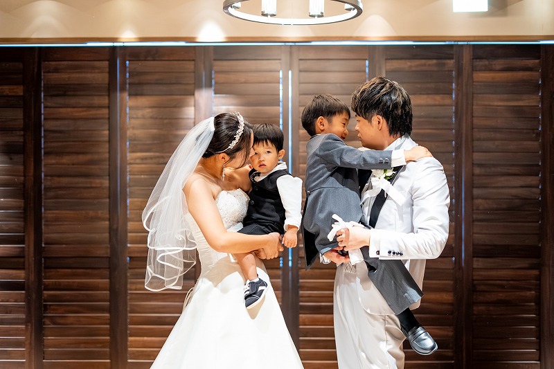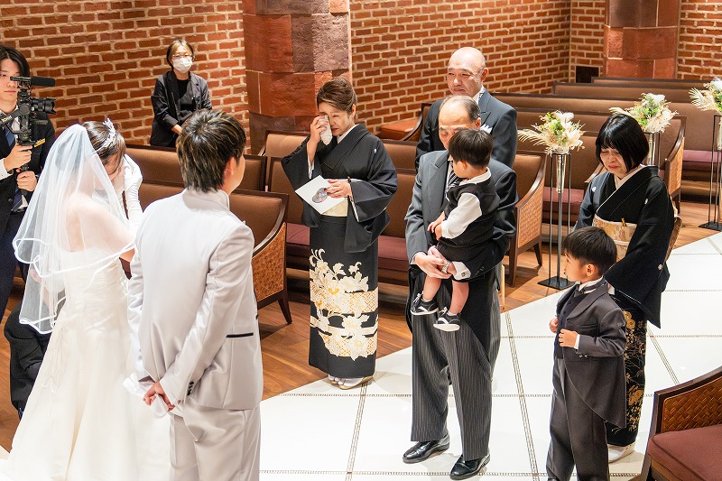 挙式はしっかりとおふたりのお姿をゲストに見守っていただきます。おふたりで誓いをたてていただいた挙式の結びにはお子様おふたりを挟んでサンドイッチキス!