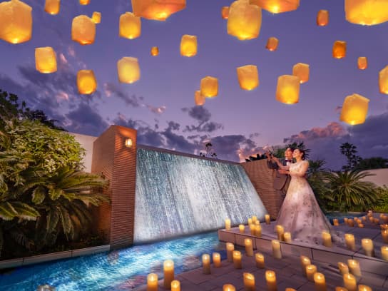 一歩足を踏み入れた瞬間から広がる、非日常の圧倒的空間。 グレイスヒル・オーシャンテラスは、 海・青空・緑に囲まれた贅沢空間と高評価の美食で ふたりらしいパーティーを叶えていただけるウエディングステージです。