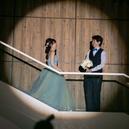 階段から新婦様が登場し、新郎様が踊り場でブーケを両手に