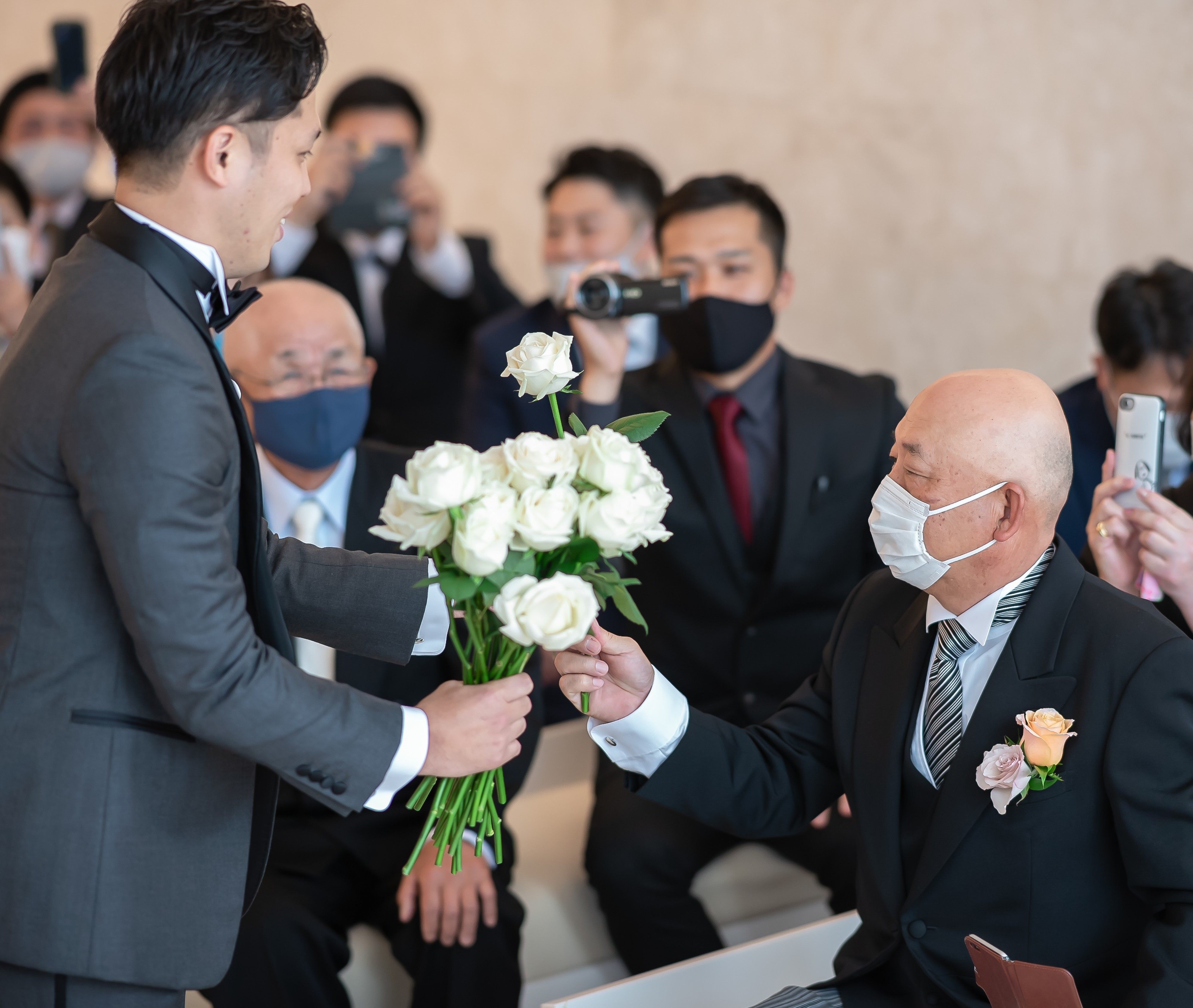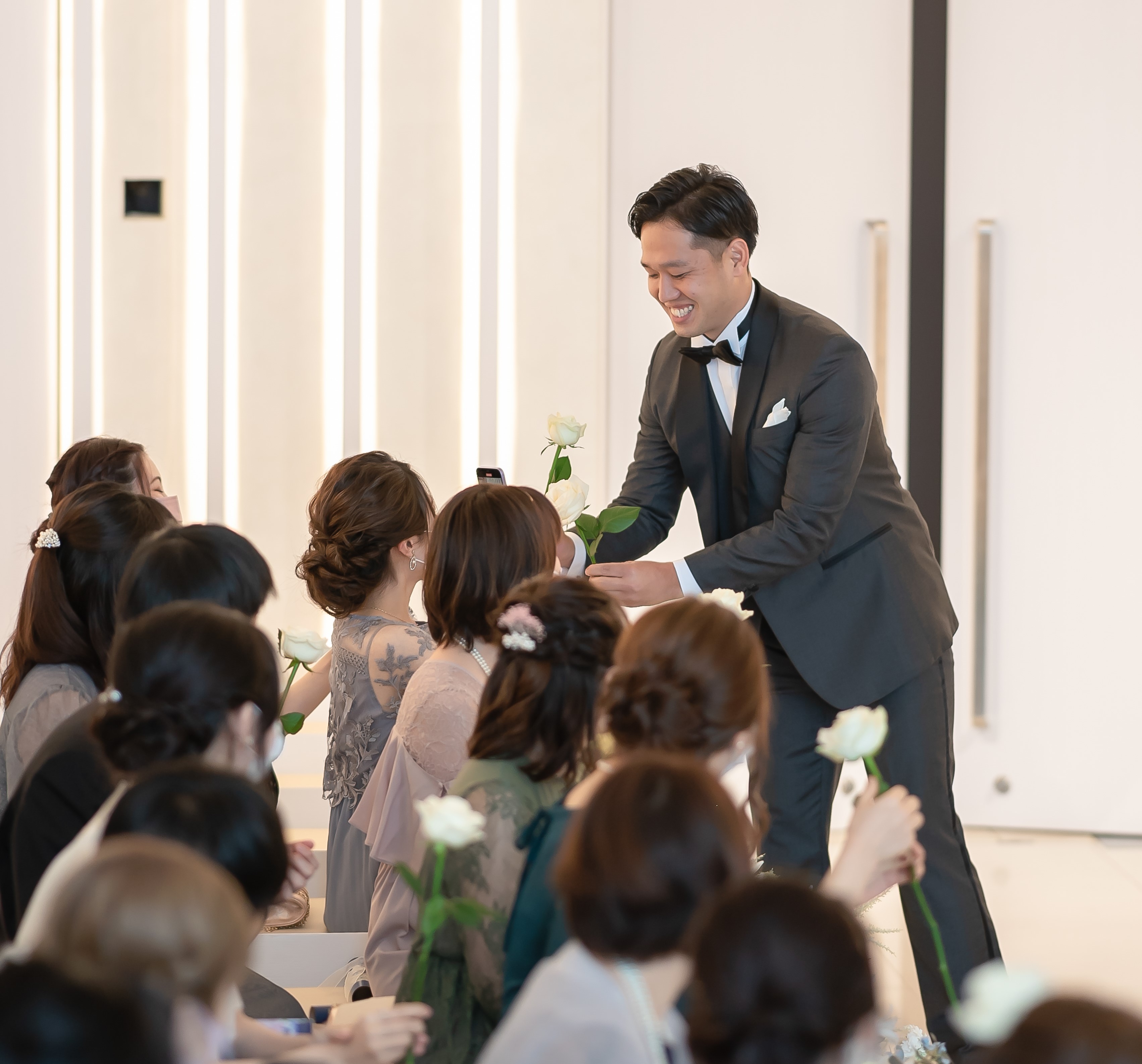 ゲストに一輪のお花をお配りし、新郎様がゲストから