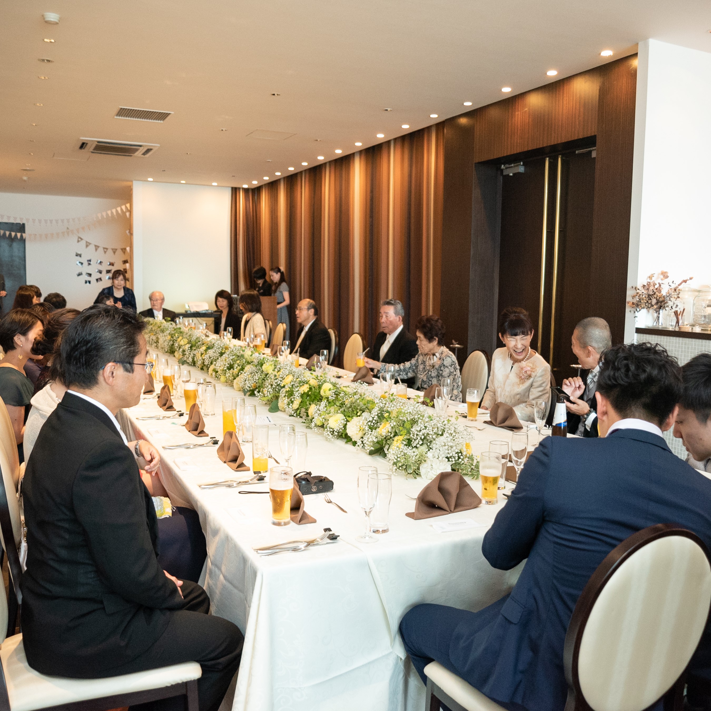 先ほどは円卓でのコーディネートをご紹介しましたが、長テーブルのコーディネートはこちら!
