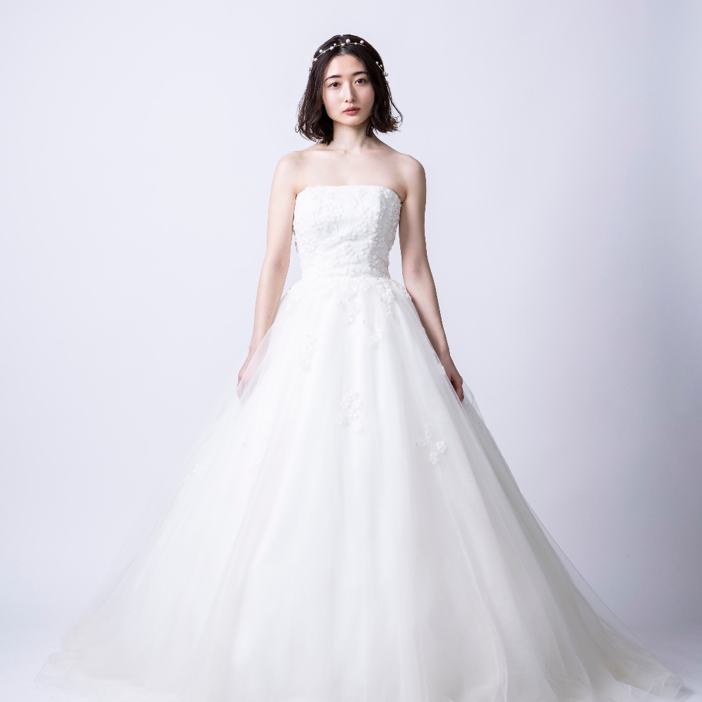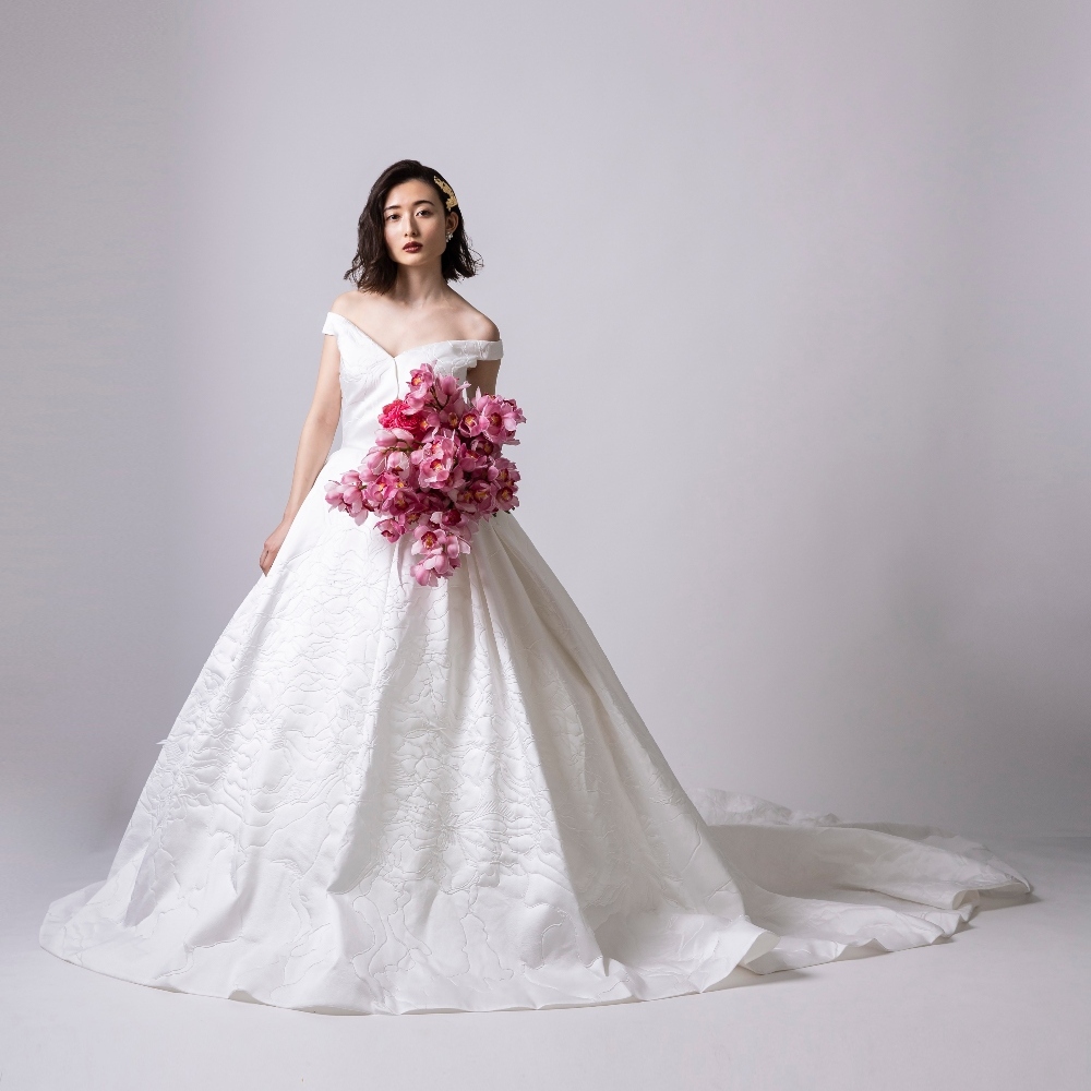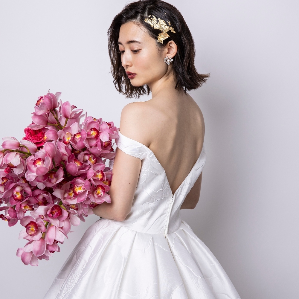 ミモザのような小花刺繍がグリーンたっぷりの会場に映えるロマンティックな1着。