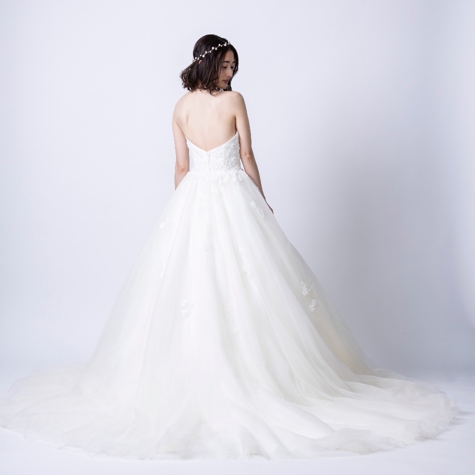バックスタイルにはフランス製のリバーレースで透かしデザインを入れることで