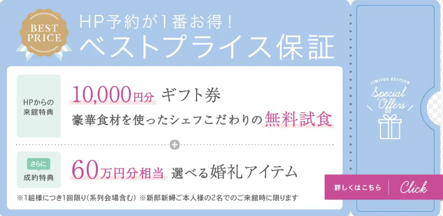 こちらをご覧いただいたおふたりには特別価格でご案内します。※40名様以上の結婚式をご成約の方
