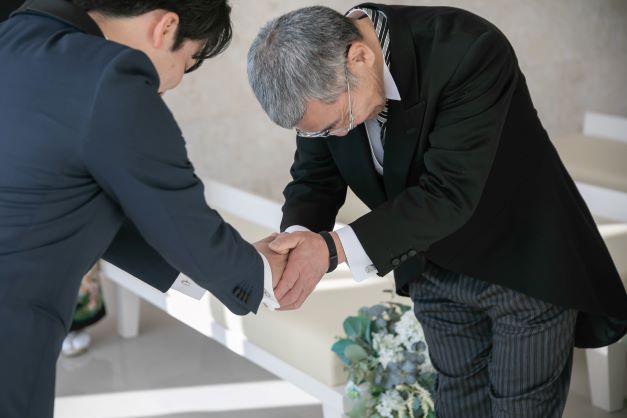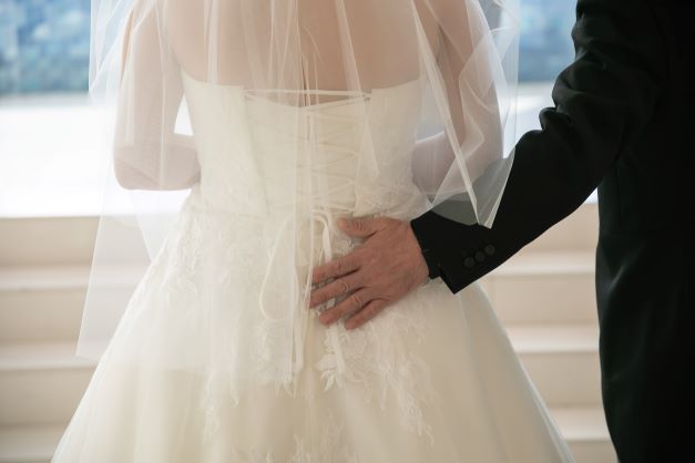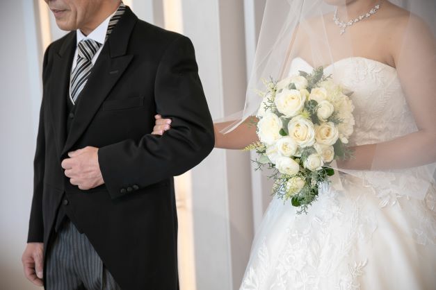 新郎様の元へ向かう新婦様の背中を押すお父様