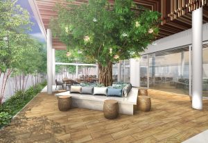 シンボルツリーが印象的な森を感じられるテラスになっております!
