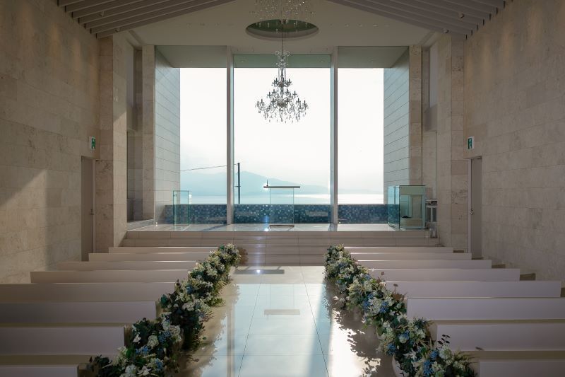 真っ白な空間に真っ青な青空と海が広がる絶景のチャペル。