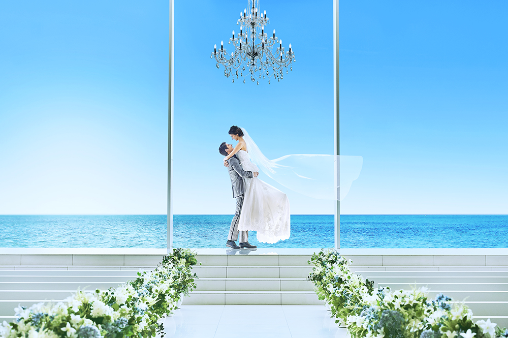 おふたりの背景には海と空がひろがり、ゲストの皆様に見守られながら
