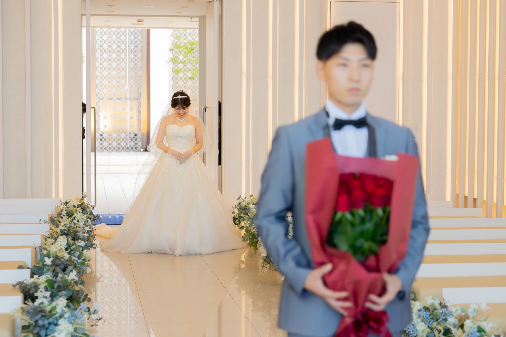 ファーストミートで振り向いた新郎様の手には薔薇の花束が