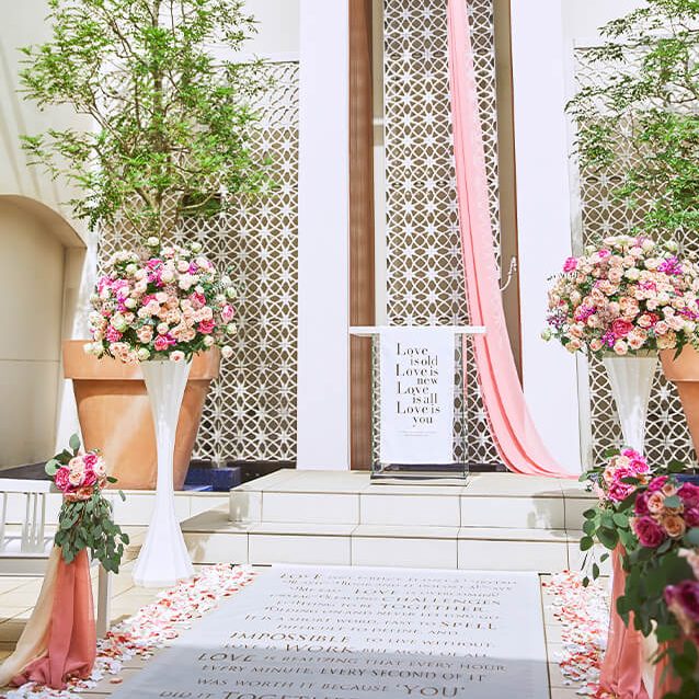 チャペルから続く吹き抜けのフラワーコートは、ゲストの方々とバルーンリリースや