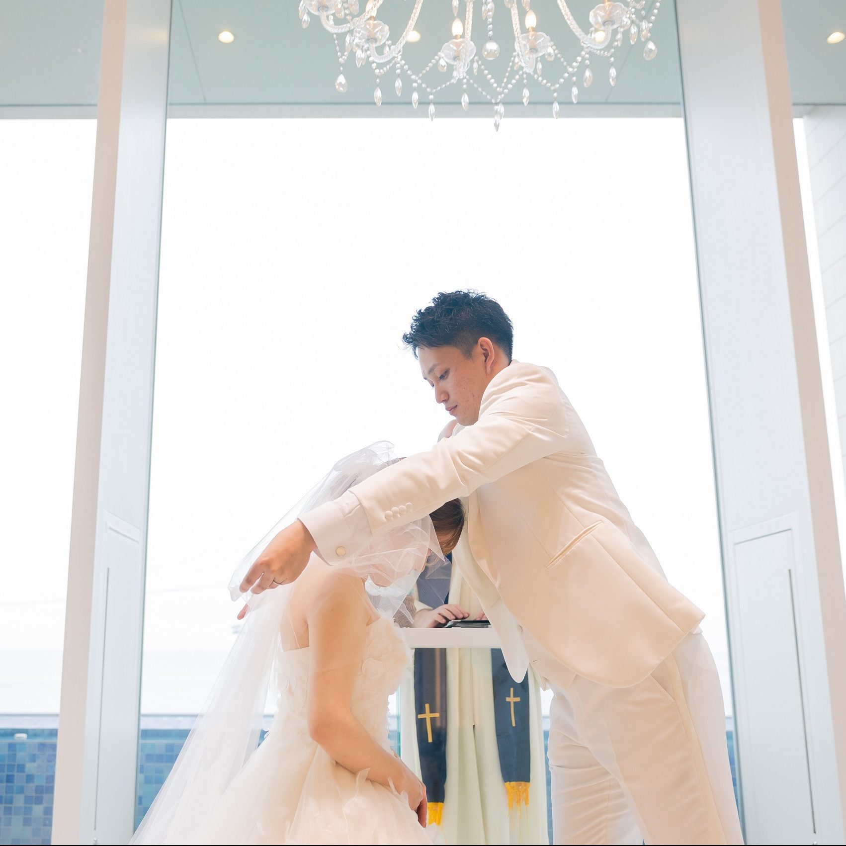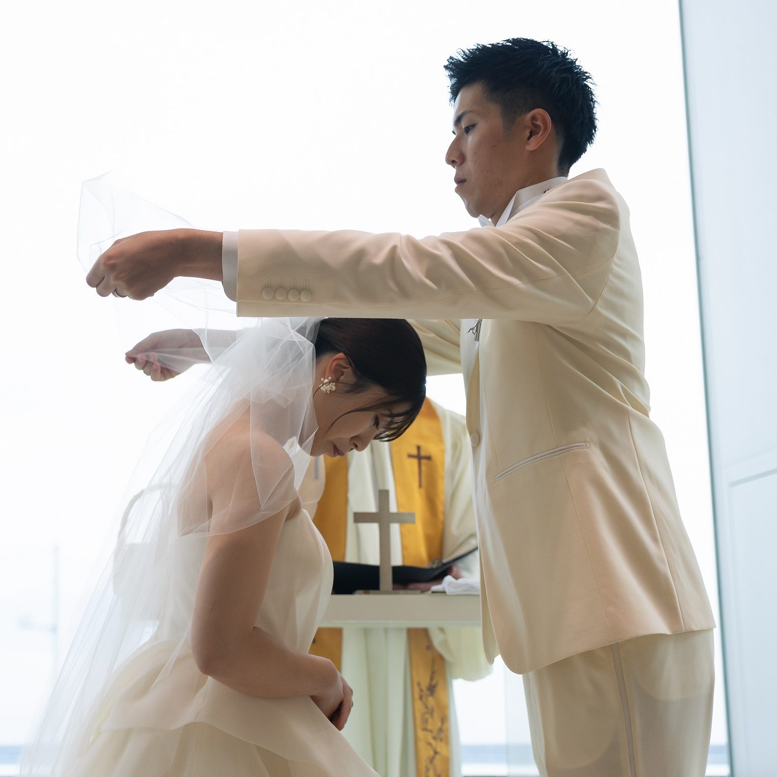 新郎様が、新婦様のベールを挙げる瞬間は