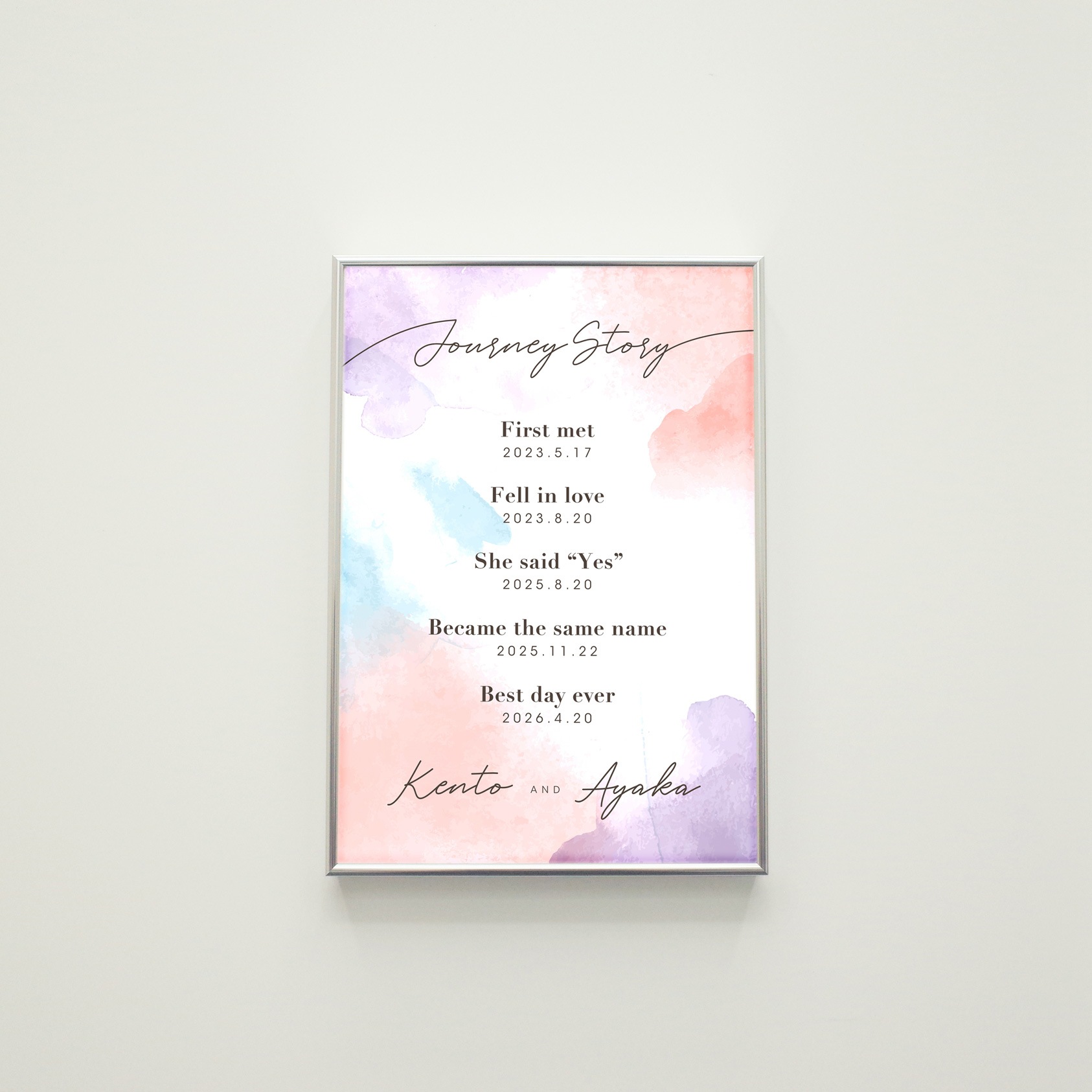 カリグラフィーでおふたりの記念日を記したラブストーリーボード。出会った日・付き合った日・プロポーズ日・結婚式日とおふたりのお名前を入れることができます。新居のインテリアにもおすすめです♩