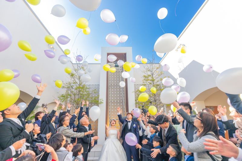 チャペルから続く吹き抜けのフラワーコートは、ゲストの方々とバルーンリリースや