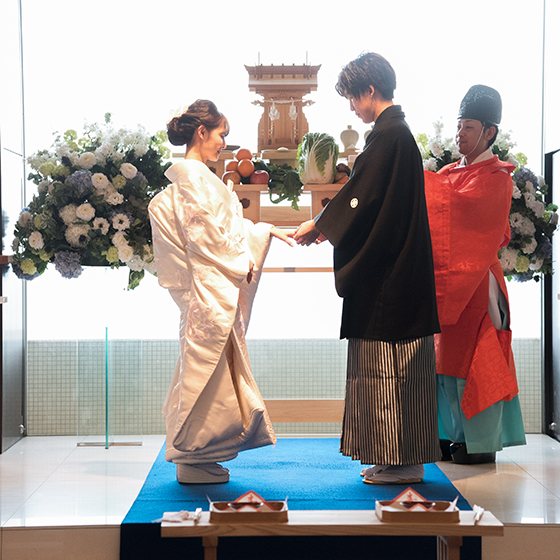 挙式に関しては、子どもの頃から「白無垢を着て挙式をしたい」という夢があり、グレイスヒルのチャペルで白無垢を着て神前式をさせていただきました。神社で行う神前式とは雰囲気がまったく違い、外の景色もとてもきれいで家族にも喜んでもらうことがき、思い出に残る挙式となりました。