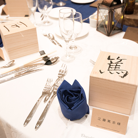 ゲスト一人一人をイメージした文字入りの木箱に入った器をセレクト。