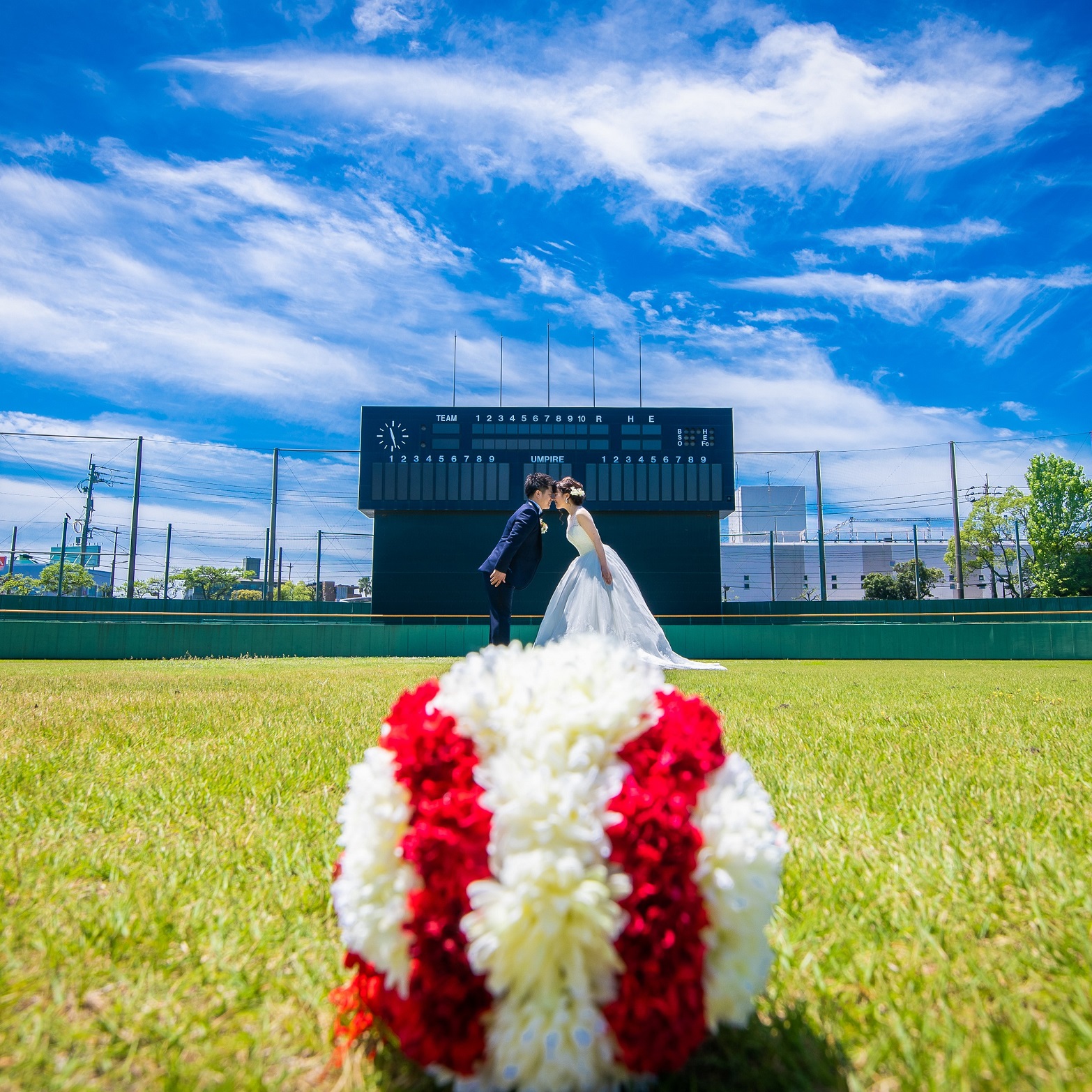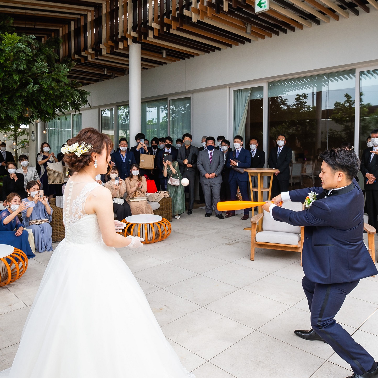 夫婦共に野球が好きで、野球をモチーフにした演出を、挙式やアフターセレモニー、