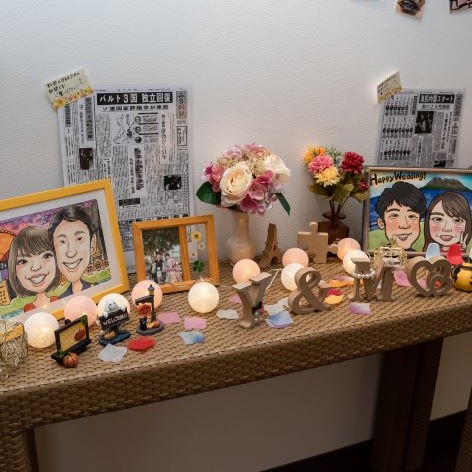 また、髪が短かったころの似顔絵と結婚式寸前の髪が長いときの似顔絵を飾り