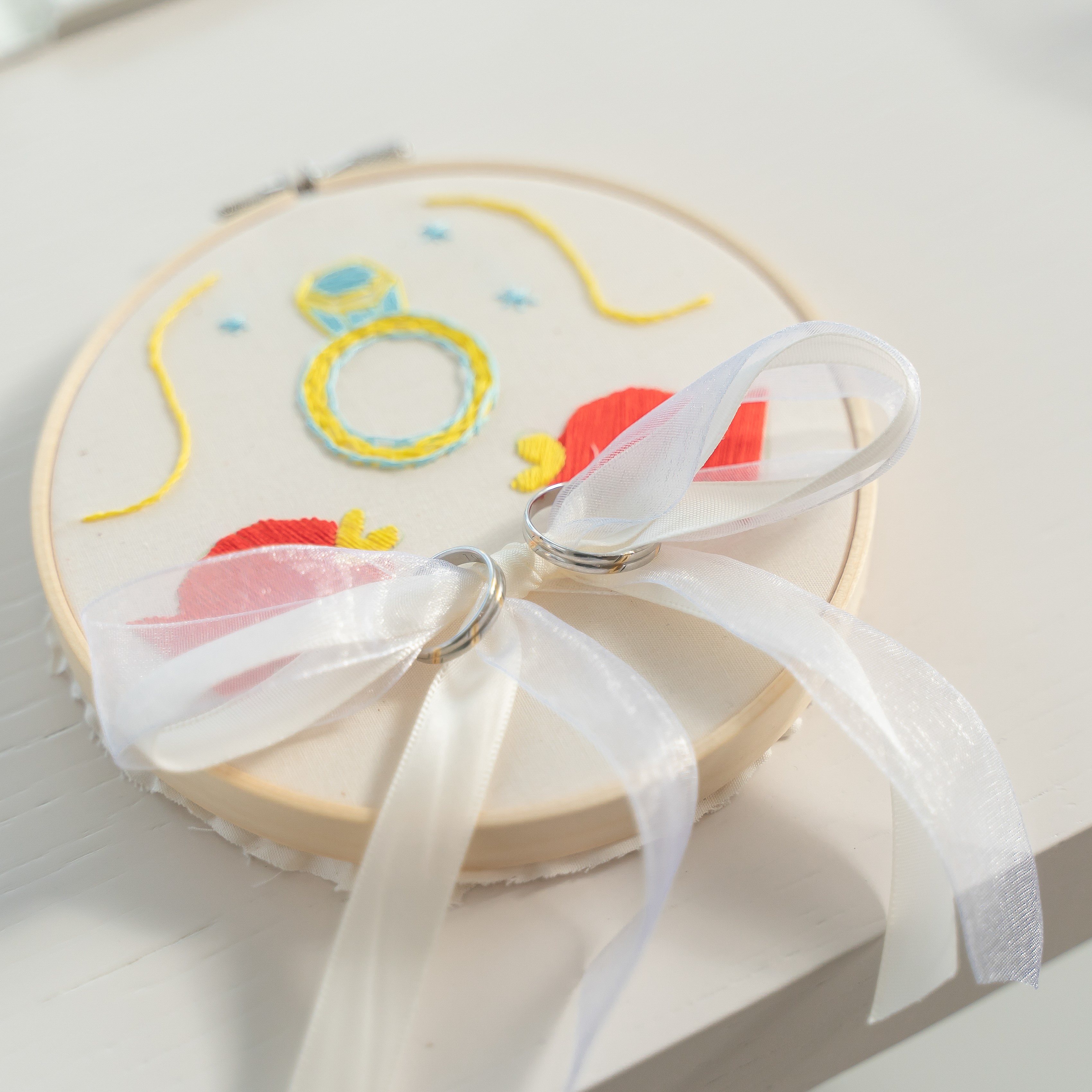 まずリングピローが鯛の刺繍、披露宴入場の際は花婿、