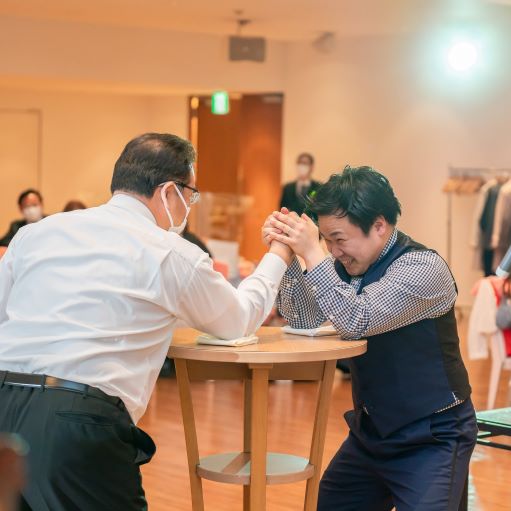 レクリエーションでは新郎新婦VS両家親で、「腕相撲とトントン相撲」をすると、