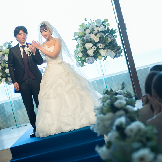 私たちは派手なことが苦手で、当初は、フォトウェディングと身内での食事会をそれぞれ別に検討していました。スケジュールや予算の面では良かったのですが、せっかくドレスアップしても撮影の時だけで、食事会の時は普段着だったり日程や場所がバラバラだったりと、少し物足りないような気がしていました。そんな時、少人数での結婚式をHPで知り、相談に行きました。海沿いの美しいロケーションで、リゾートビューの素敵なの式場で、写真撮影とドレスでの食事会プラス、チャペルでの人前式などを1ヵ所で1日でできる事と、何よりもスタッフの皆さんがとても親切でプロフェッショナルな対応で、私たちの不安を、安心と期待に変えてくれました。試食させていただいた内容もお世辞抜きで感動モノでしたので、即決しました。