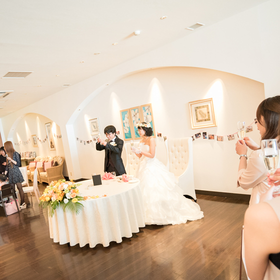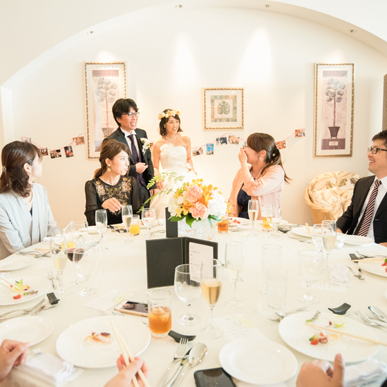 ゲストの皆さんに、ゆっくり食事を味わって楽しんでいただきたいという思いで、食事の内容にはこだわりました。そして、アットホームな雰囲気をつくる事にもこだわりました。私たちとゲスト、ゲストとゲスト、それぞれの会話、思い出話など語り合える、くつろげる空間にしたいと思いました。ですので、スピーチや余興の出し物などゲストの皆さんの負担は極力少なくして、ゆっくりとした時間とムードの中で、会話と食事を楽しみ、皆さんの絆を深められるように準備しました。少人数だからできることだと思います。