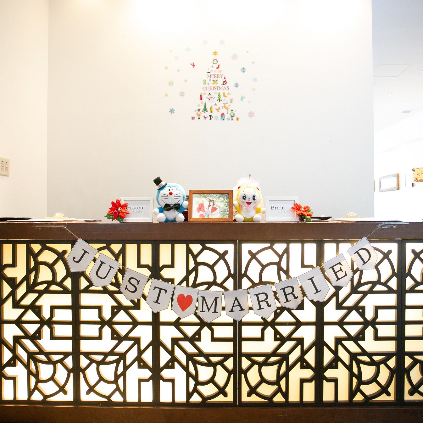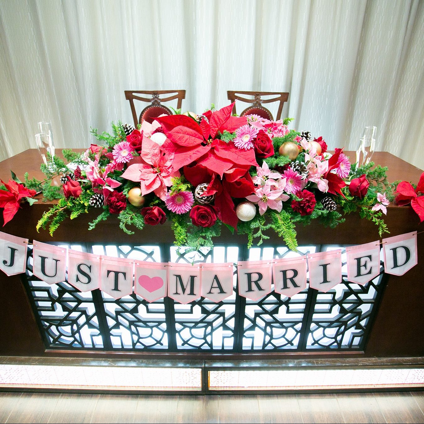 そして、丁度クリスマスシーズンだったので、披露宴会場をクリスマスでいっぱいにしてもらいました。クリスマスらしさを出したいけど、新婦の好きなピンクも入れてほしい...というワガママなお願いをしましたが、ピンクのポインセチアを使ってもらい、とても可愛いイメージ通りの装花にしてもらいました。高砂にもツリーを飾って頂き、ウェルカムスペースや席札や音楽など、クリスマスに拘りました。プロジェクションマッピングもクリスマス仕様にして頂き、再入場からは一気にクリスマスムードにしました。