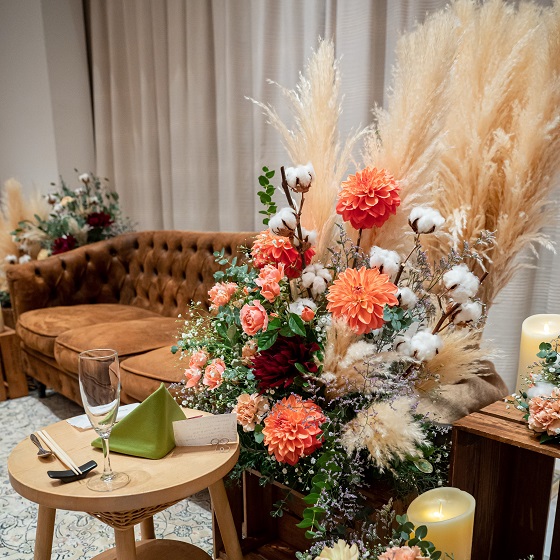 ②会場の装花は、冬のイメージに合った色や素材を使ってもらいつつ