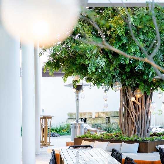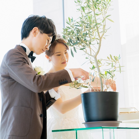 まず、鹿児島市の式場を探していて、最も印象的だったのが、グレイスヒルのシンボルツリーでした。そこで、シンボルツリーを見るために、式場見学に行かせていただきました。見学して、シンボルツリーがあるテラスは想像していたよりも広く、披露宴会場とつながっており、披露宴会場とはまた別のカジュアルな雰囲気がとても気に入りました。また、会場内でのプロジェクションマッピングも見させていただき、式のイメージも湧かせることができました。そして、当日担当していただいたスタッフの方と話していく中で、式の内容・構成の自由度がかなり高いことを聞き、理想の結婚式ができると思い、この式場に決めました。