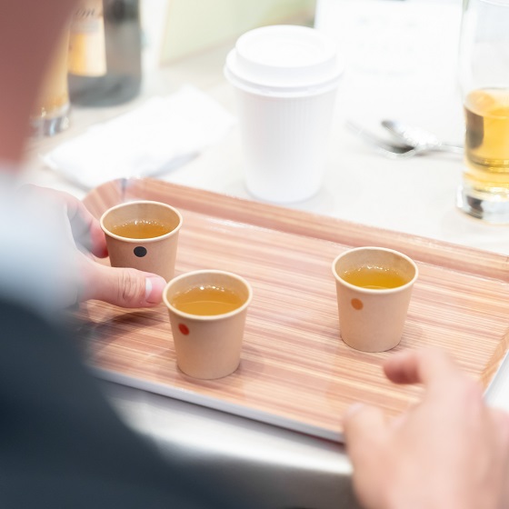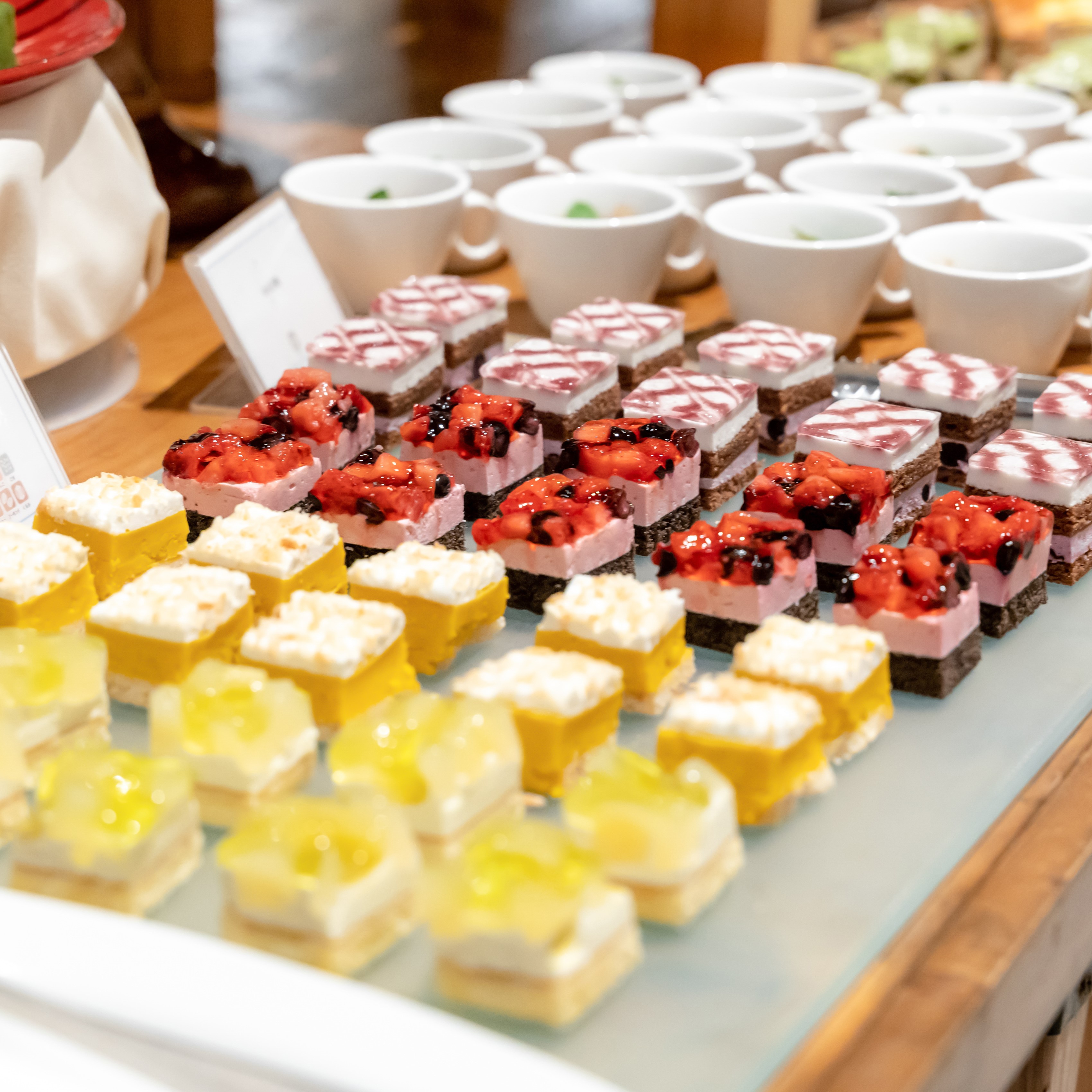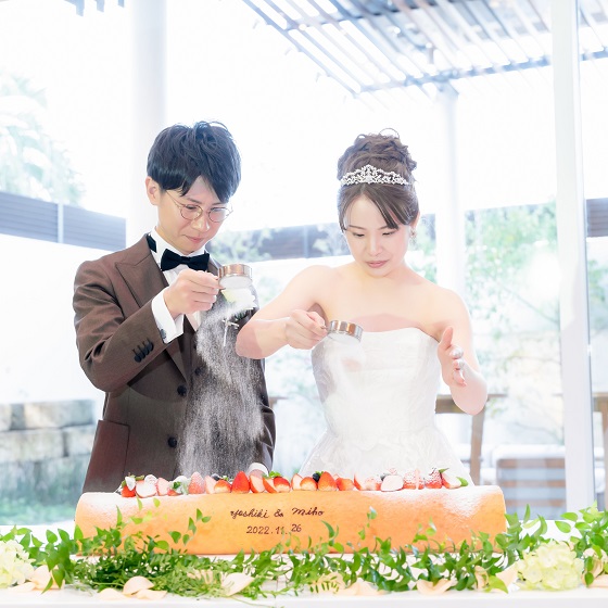 披露宴の内容としては、ケーキセレモニーは一捻りしてゲストを驚かせたいと思い、ロールケーキに粉を振り、そこにかぶりつく形にしました。余興では、ゲスト参加型の「お茶の産地を当てる利き茶」クイズを行い、クイズで盛り上がった後には、サプライズでデザートビュッフェを用意しました。そのデザートビュッフェの際に、できるだけ多くの方とお話ができるように披露宴時間を30分延長してフリータイムの時間を設けました。