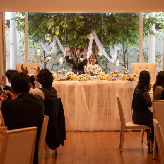 装花にもとてもこだわりました。白メインで、本やロウソクを置いて、大人可愛くしてほしいと伝えました。ゲストテーブルも落ち着いた雰囲気でまとめてもらいました。曖昧に伝えたにも関わらず、とても満足のいく高砂・ゲストテーブルになりました!!