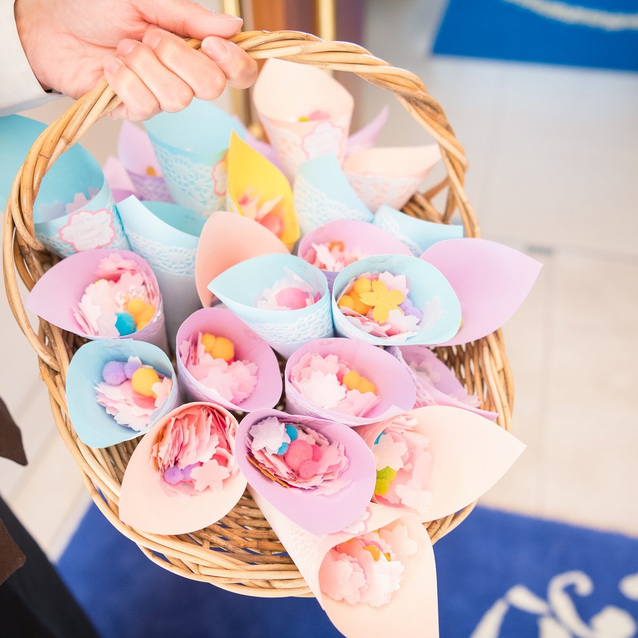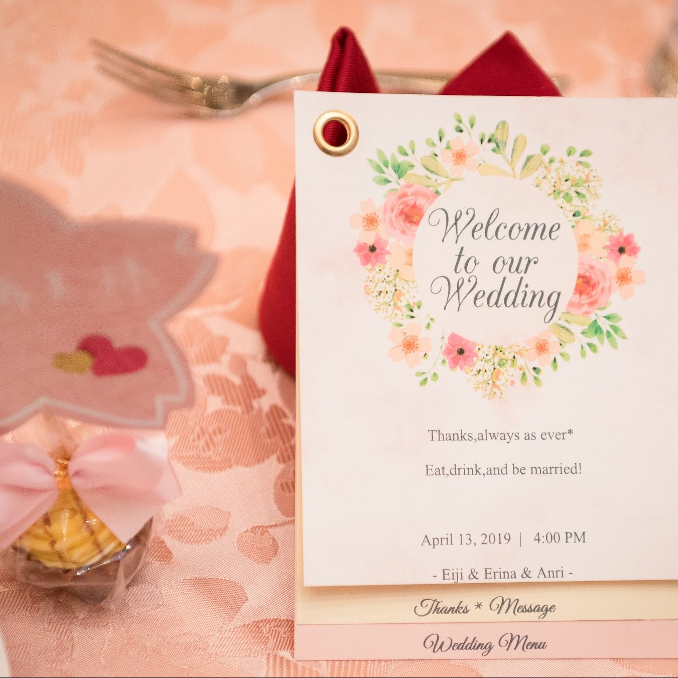 メニュー表も席札も桜シャワーも全て桜のもので手作りしました*