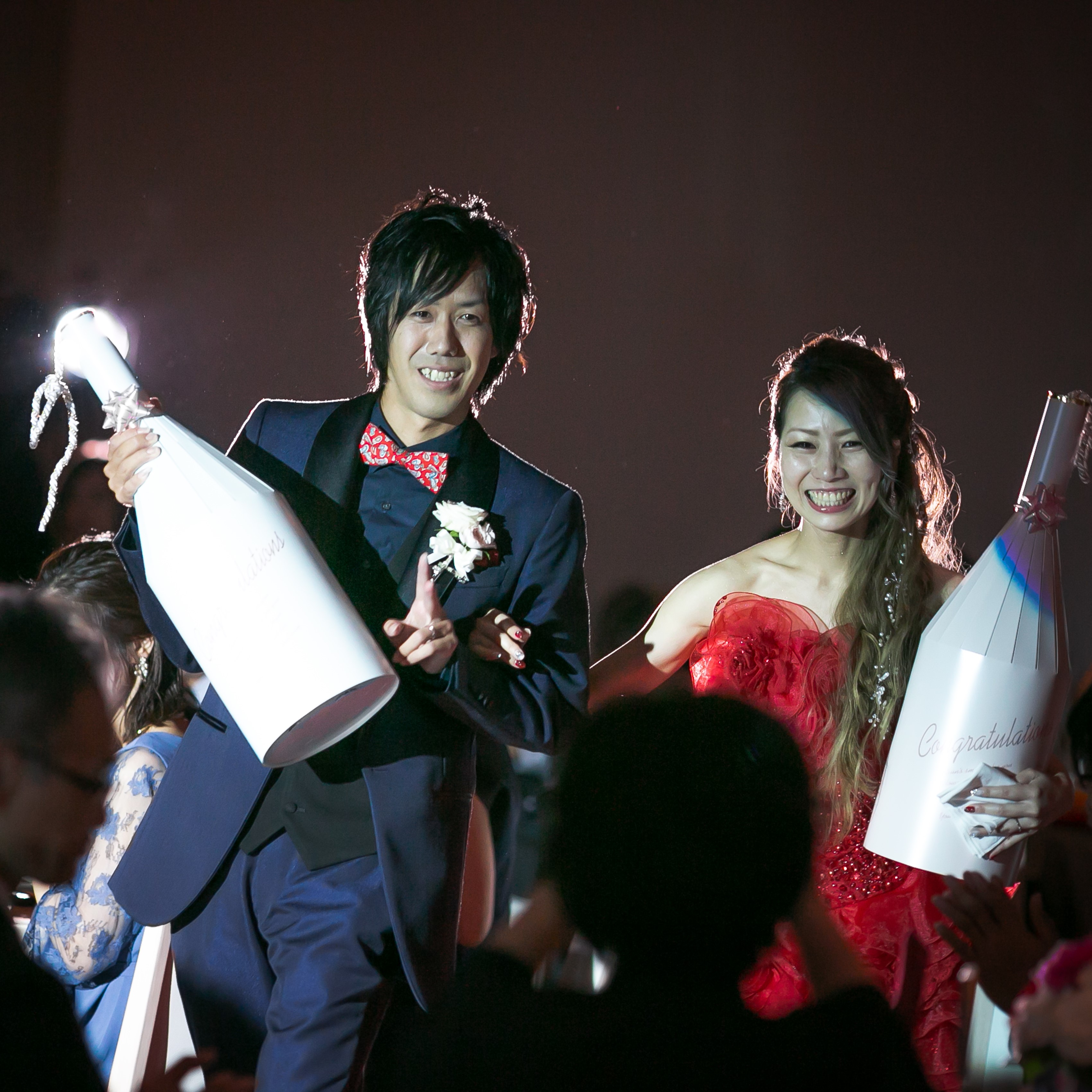 2人が大好きな曲で、新郎は正面扉、新婦は階段から入場。