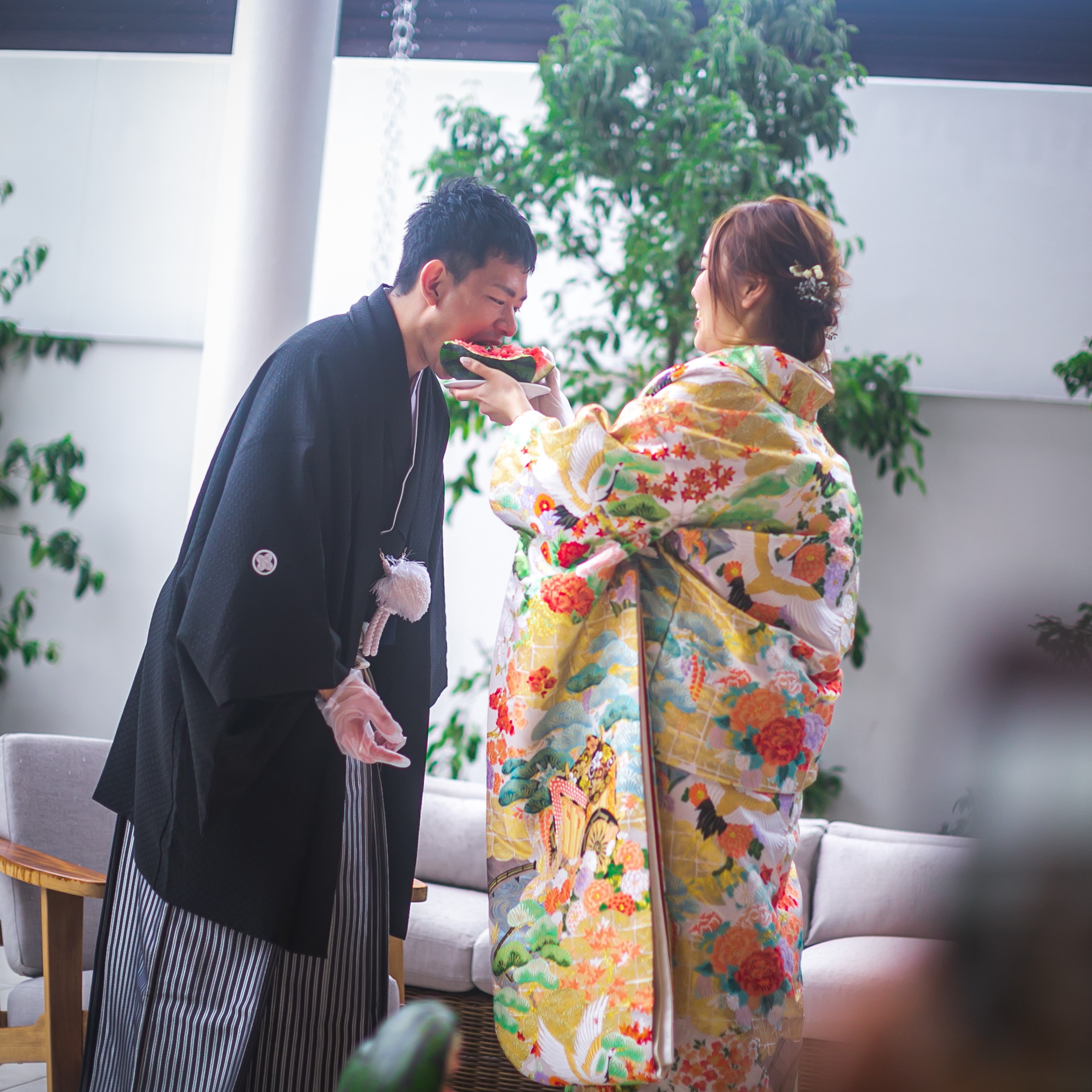 共同作業では、ケーキ入刀ではなく夏らしくスイカ割りをしました。