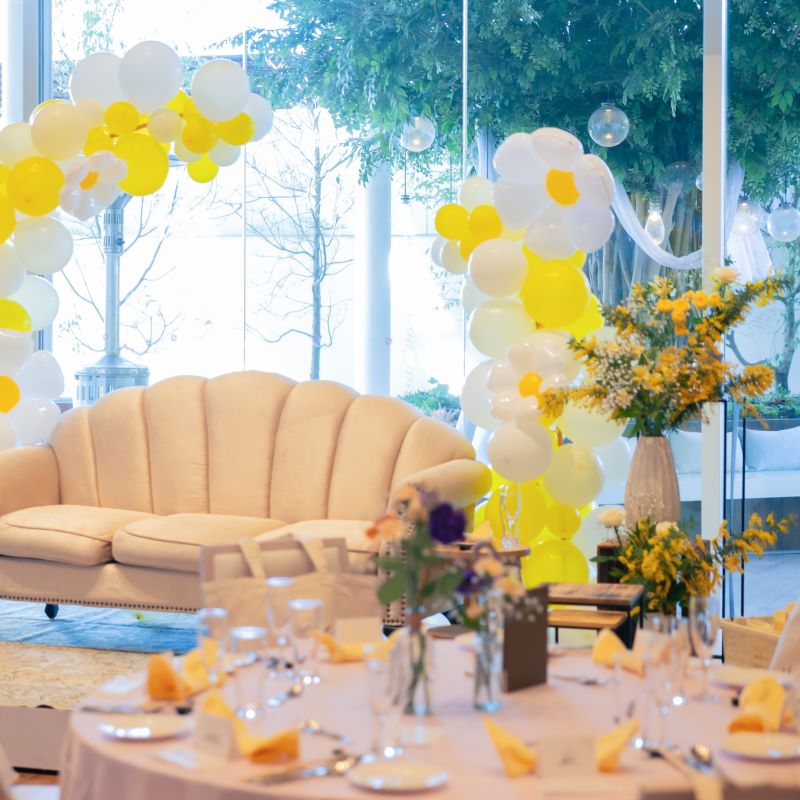 アイテム面でこだわったことは、披露宴の高砂ソファの後ろの風船をアーチ型にしたり風船の色やウェルカムスペースのウエディングドロップスでは参列者一人一人の名前を刻印してパズルにした部分にこだわりました。