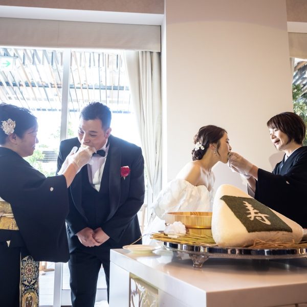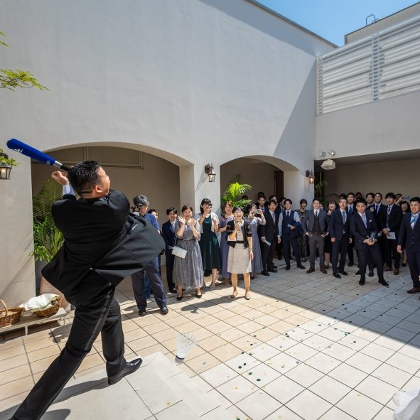 "とにかく楽しくて楽しくてしょうがない1日になりました。台風の心配もありましたが、見事晴天!天気にも恵まれ、全てやりきった1日でした。それぞれのイベントもとても楽しかったですが、何より参列していただいたみなさんが笑顔で楽しんでる姿を見れたことが1番嬉しかったです。また、2人のテーマの1つにあった両親への感謝の気持ちも伝えることができました。わたしたちがやりたい!と思ったことをプロデューサーさんをはじめ、スタッフの皆さんのアイデア・サポートをいただき全て叶えることができ、感謝しています。