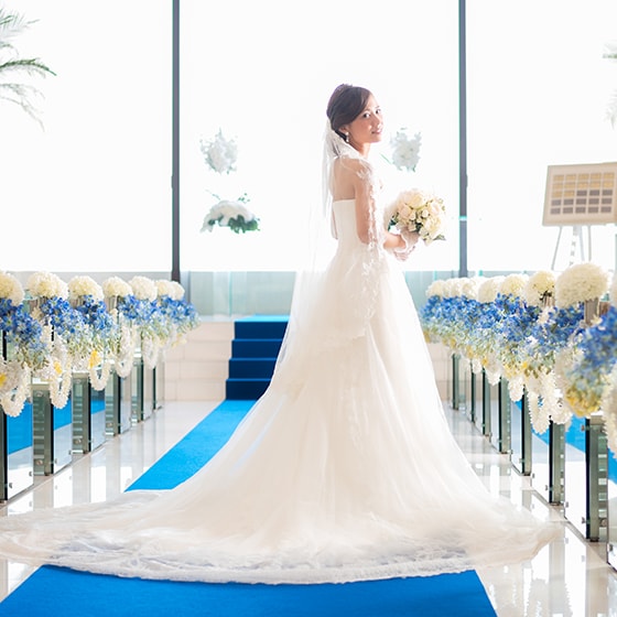 チャペルは目の前が海になっており、海と空が一体になっている本当に綺麗な眺めで、挙式の前に家族に向けての感謝の気持ちを送る映像を流してくれる演出もとても素敵だなと思いました。
