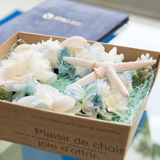 ふたりとも海が好きという事で、式場のコーディネートも海のものを選びました。