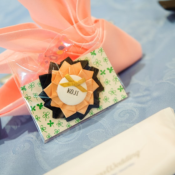 おもてなしは、私達の結婚式に出席してくれる人たち一人ひとりに名前入りのロゼットを作り、一言手紙も添えました。親しい友人、親戚、両親になかなか照れくさくて伝えられない感謝の気持ちを伝えることが出来ました。