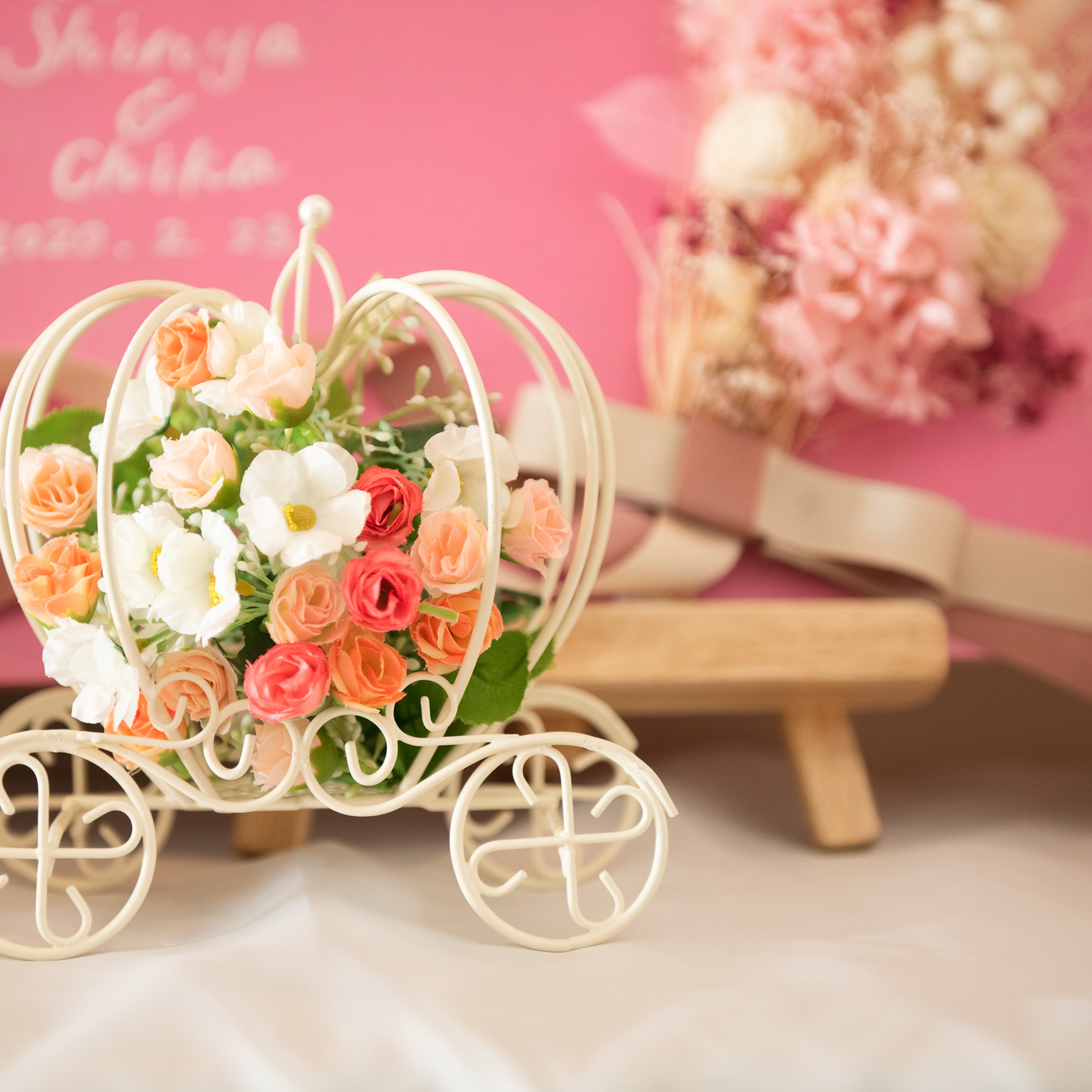 リボンシャワー、フェイクケーキ、ウェルカムボード、テーブルナンバー、メニュー表、ムービーなど作成しました。