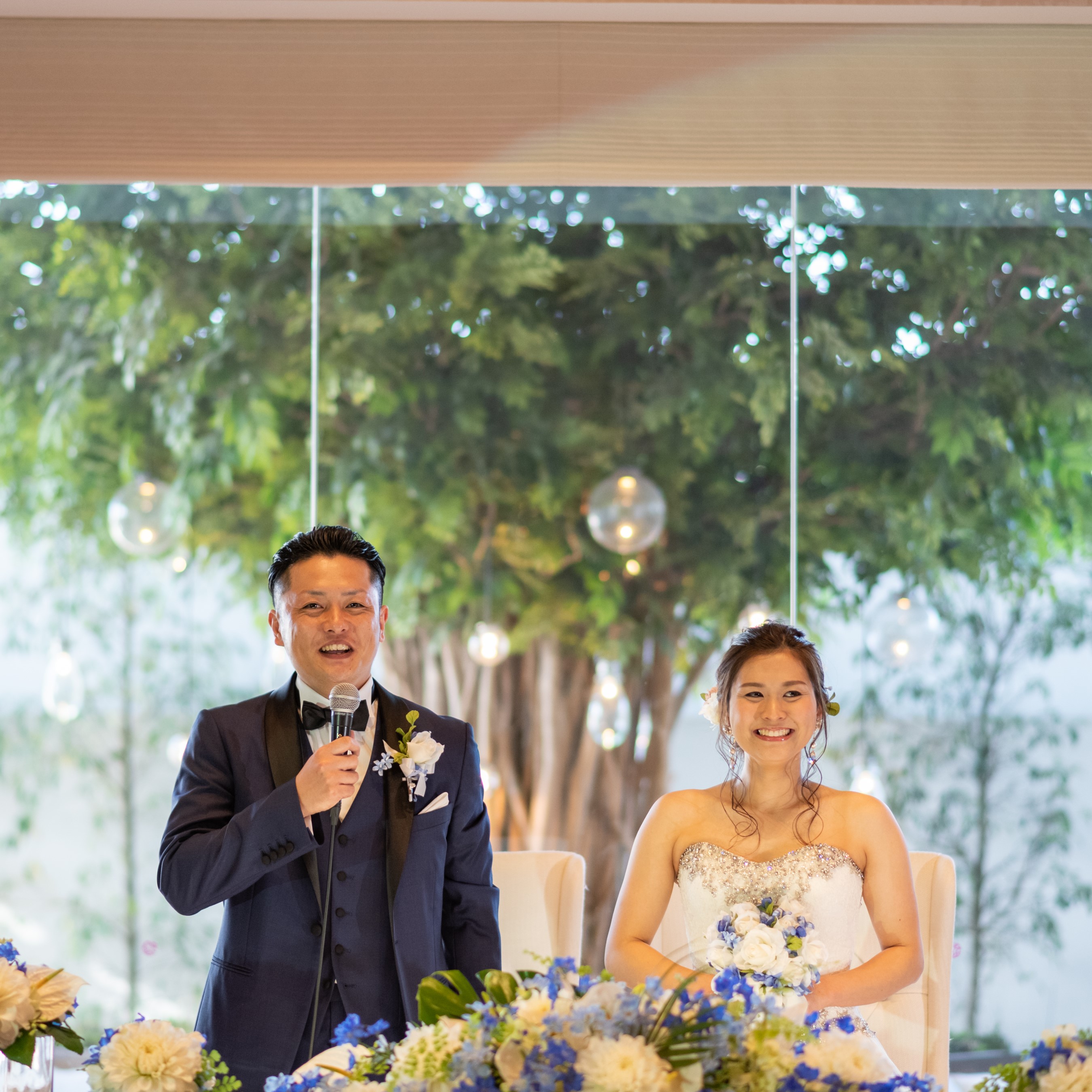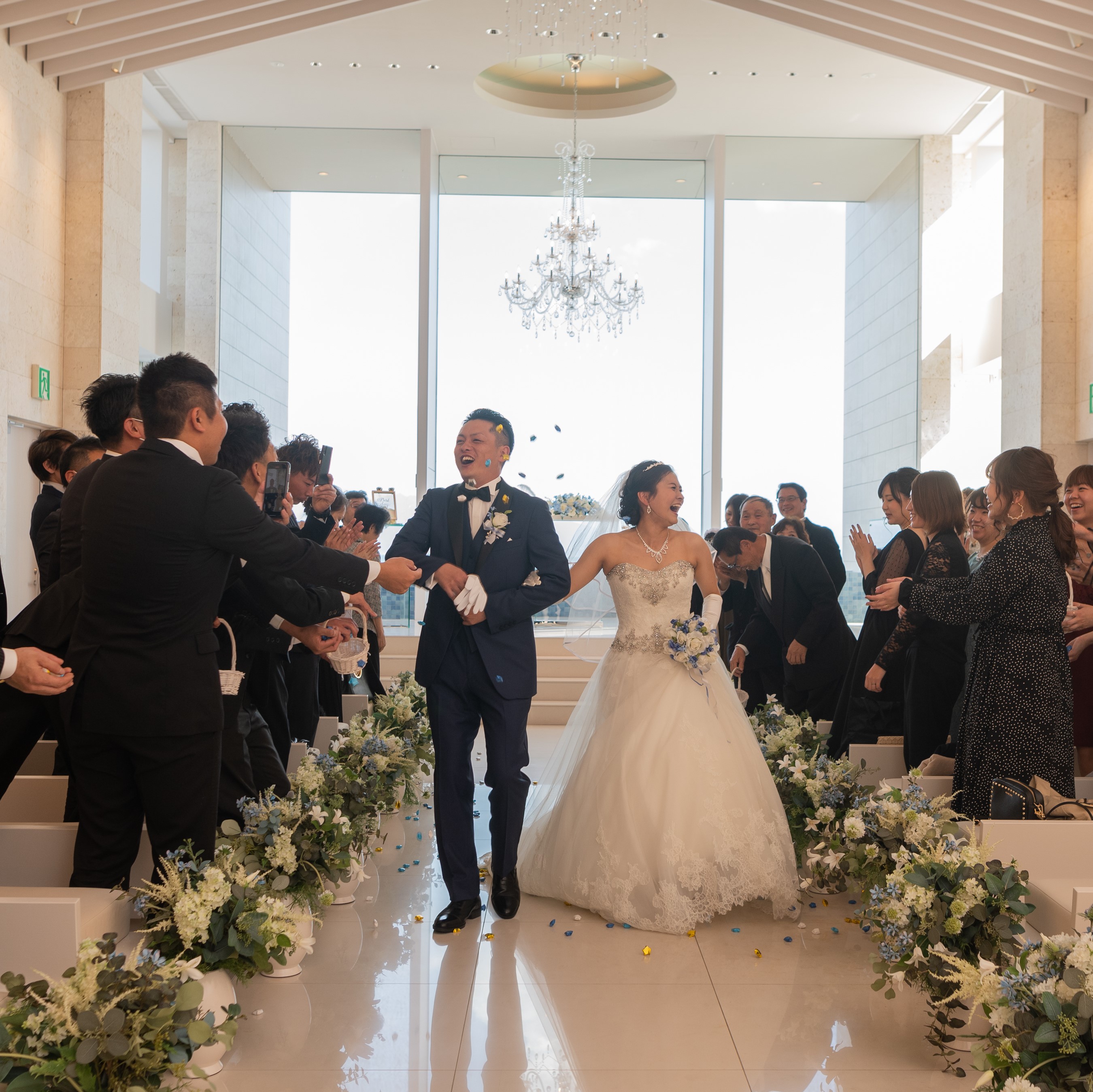 2人の大好きな海と西海岸風をテーマにし、全体を青や白で統一感を感じられるようにしました。また、スターシャワーやブーケも海っぽい印象のものを持ち込みました。