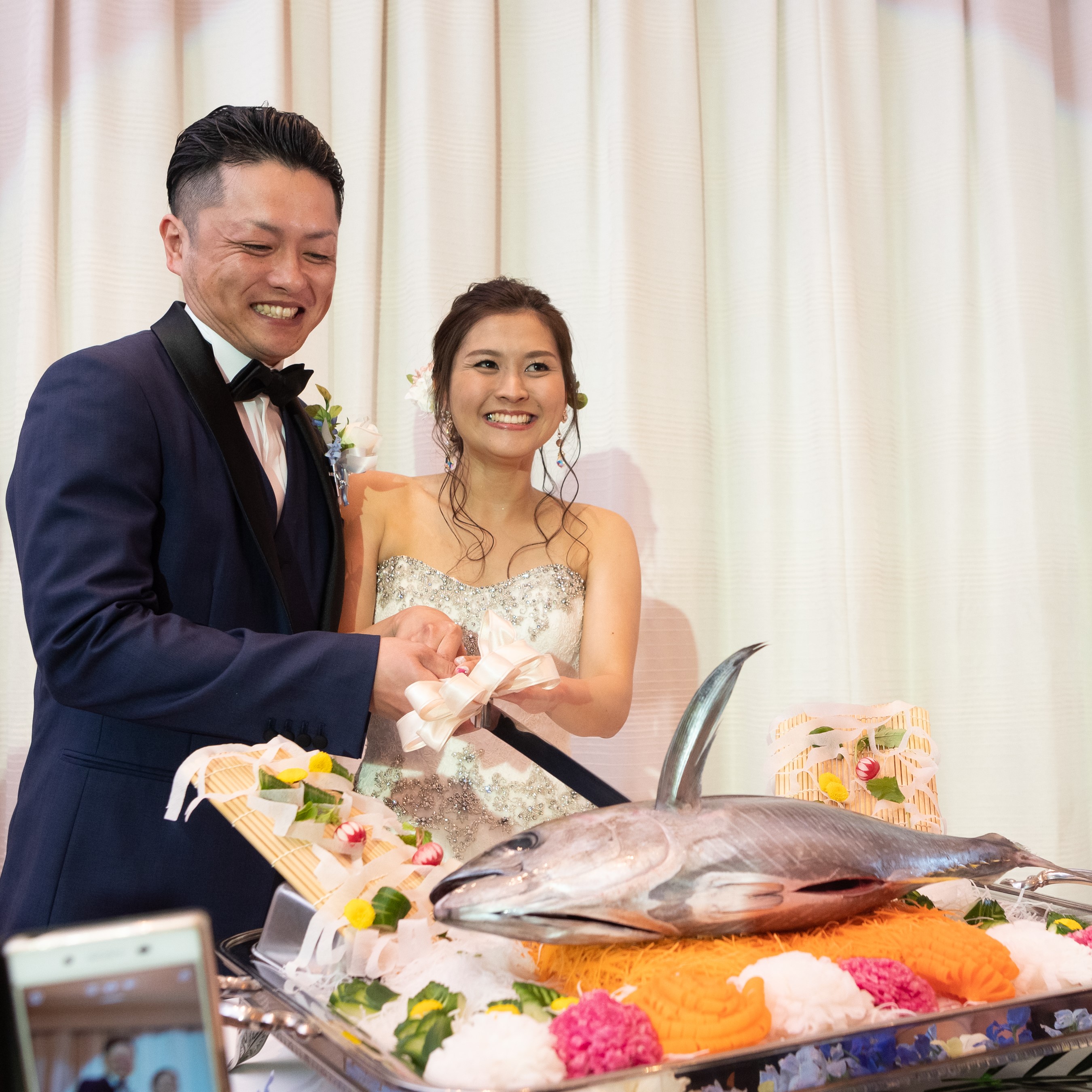 さらに、海にちなんでケーキカットはマグロで、ファーストバイトはマグロの漬けでやりました。衛生上の問題でその場で切り分けて振る舞うことはできなかったのですが、抽選で選ばれた10名にマグロ丼を別で用意していただきました。