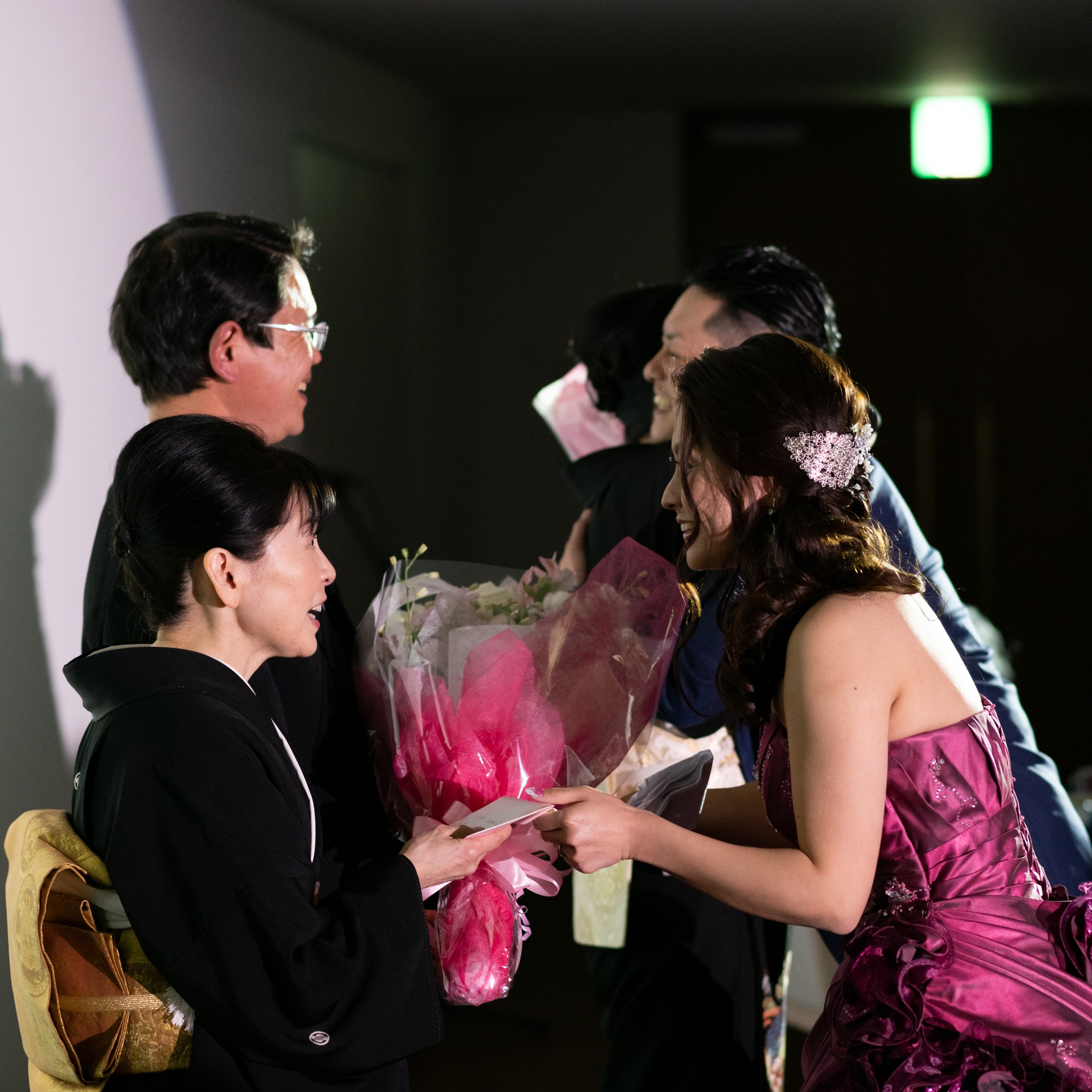 娘も式に参加できたらいいなと思い、間に挟んで誓いのキスをしたり再入場で娘もお色直しをして一緒に再入場したりなどちょこちょこ出番を設けられるようにしました。式場見学のときからやりたかったボルケーノをどの場面でどのタイミングでやるかということもこだわり音楽担当の方とも打ち合わせをして絶妙なタイミングでボルケーノを出してもらいました。いろんなこだわりを詰め込んで私たちらしい式になるようにしました。