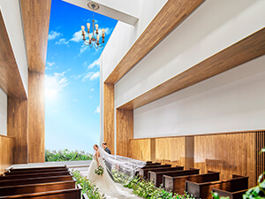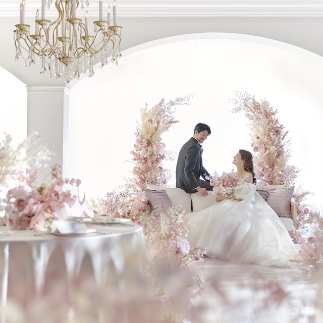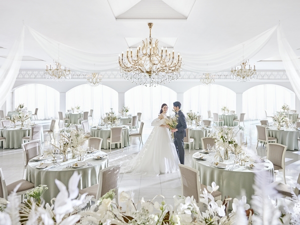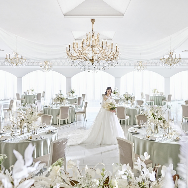 華やかで開放的な雰囲気に包まれた、フレンチコロニアルスタイルの上品なバンケット。白を基調とした空間は、お花や小物のアレンジ次第で、雰囲気や印象を変えられるのが魅力。おふたりのテーマに合わせた、多彩なコーディネートが映える空間です。