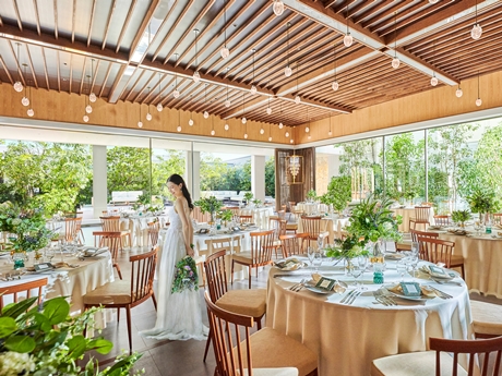 美しいアーチを描くバンケットの窓からは、プールのあるプライベートガーデンの景色が広がります。バンケットから続く開放的なガーデンを自由に使えば、まさに楽園にいるようなリゾートウエディングを実現できます。リラックスした雰囲気の中、デザートビュッフェやドリンク片手の歓談タイムなど、ゲスト全員と会話を愉しめる笑顔あふれるひと時をお過ごしください。